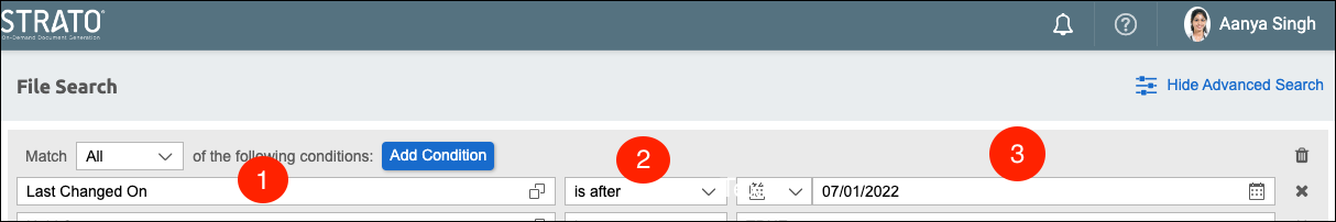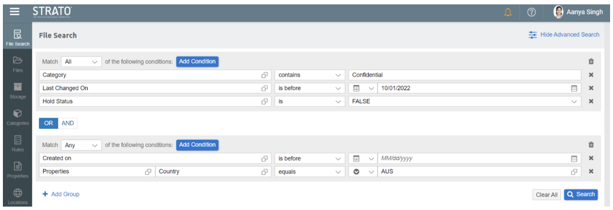 For more specific queries, the Advanced Search feature enables users to build more detailed search conditions. This can be accessed by clicking the Show Advanced Search option beside the Basic Search bar. Using this tool, you can add multiple conditions based on file attributes or metadata fields, and specify how the conditions should be evaluated.