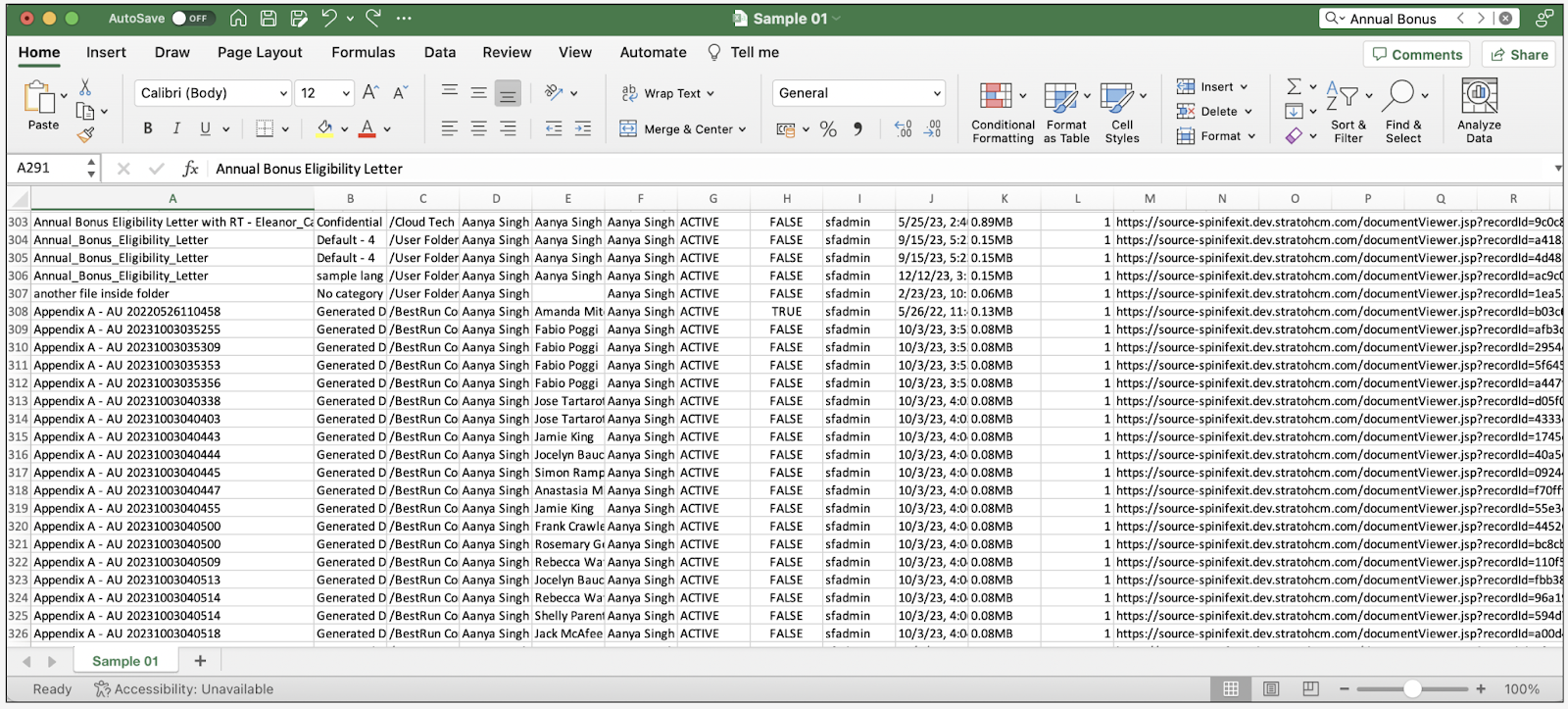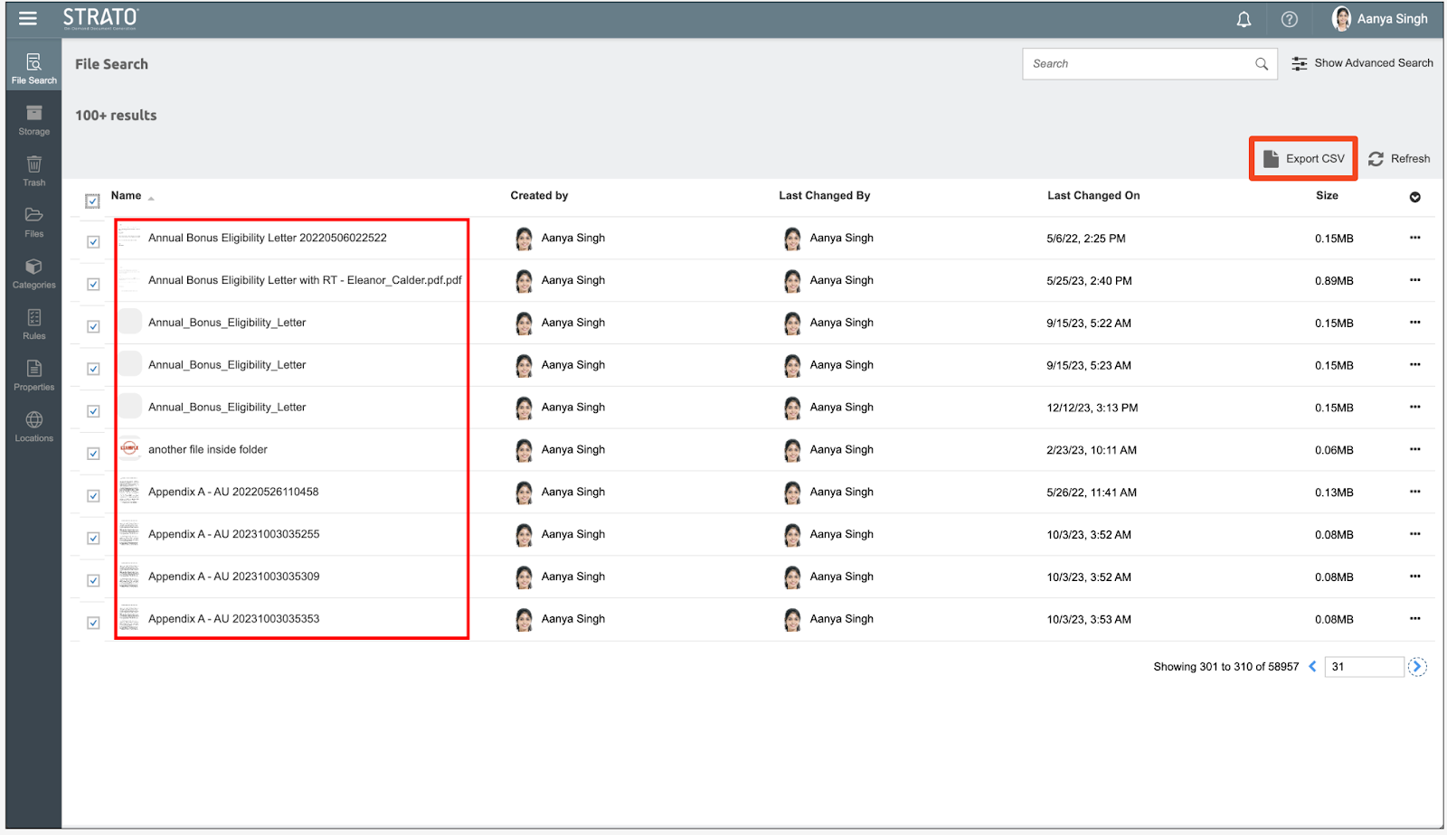 Individual files can be downloaded directly, or users can choose to export the entire result list to a CSV file. The exported CSV includes file names and corresponding download links, which can be useful for reporting or audit purposes.