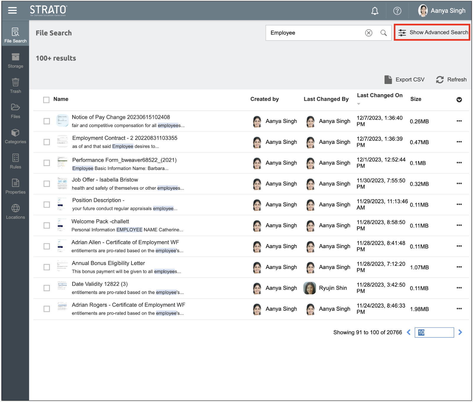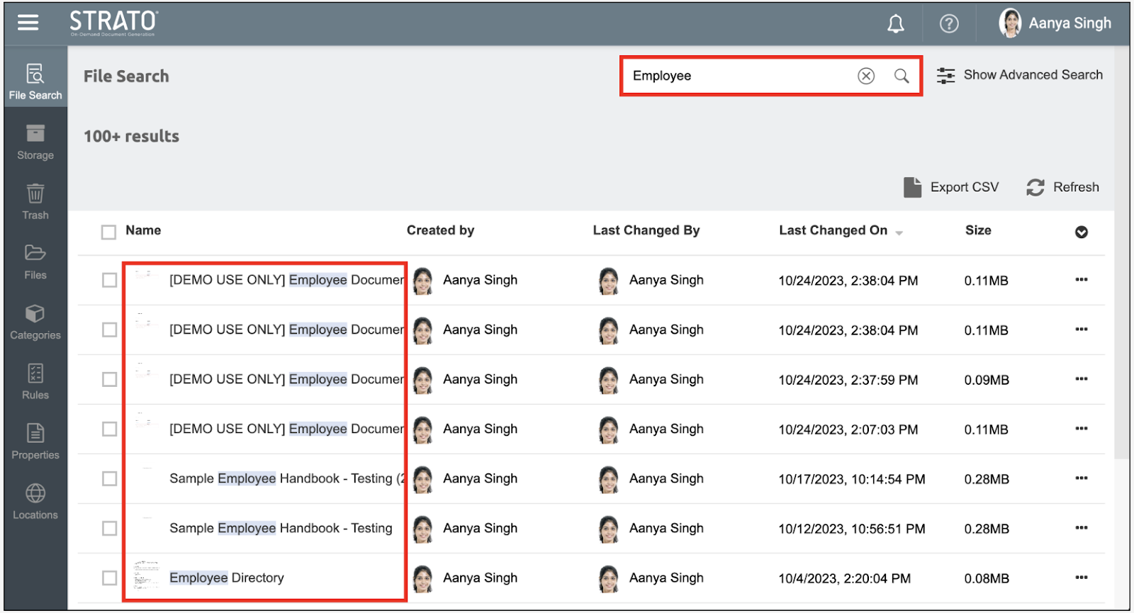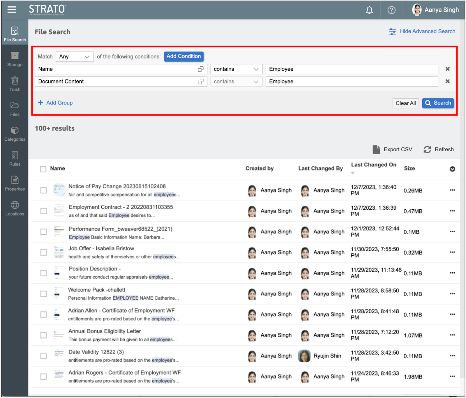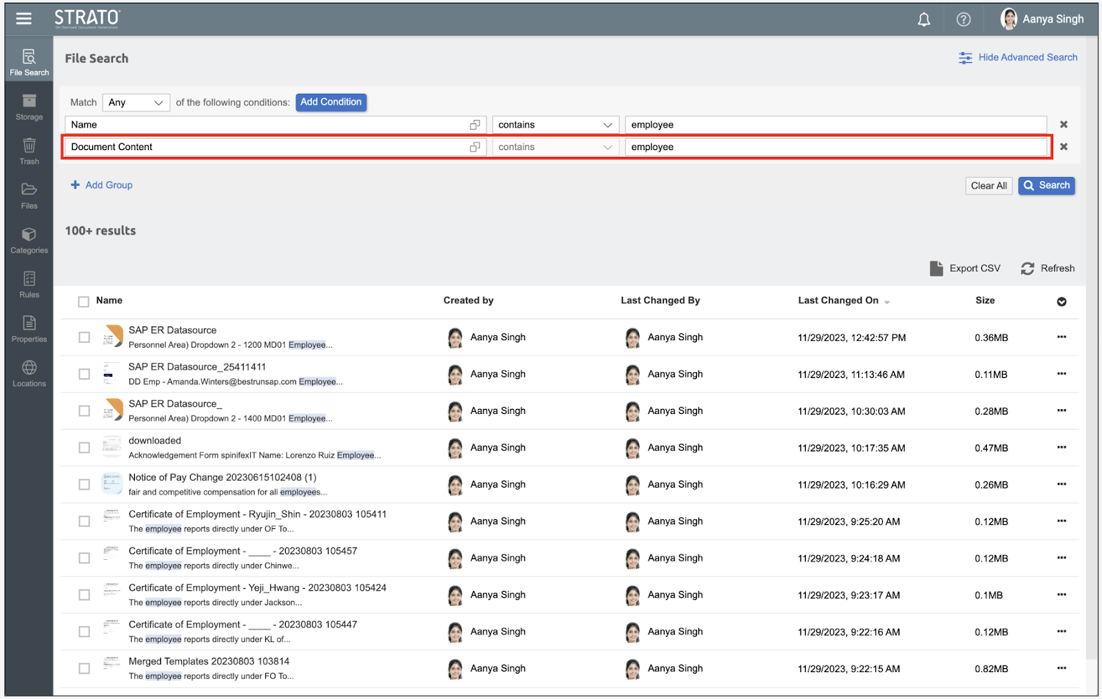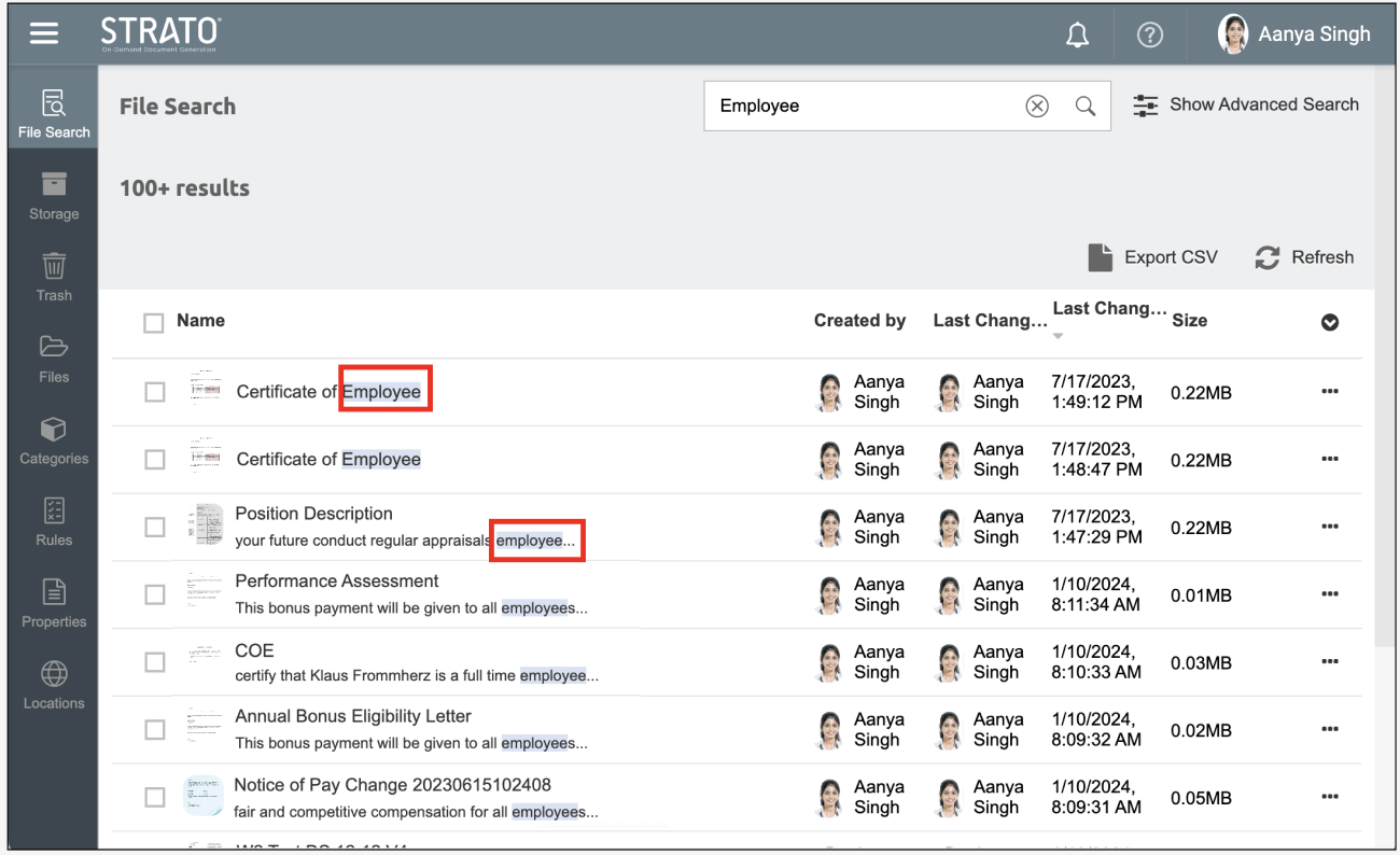 In Strato Storage, the Content-Based Search feature allows users to search for specific documents by utilizing keywords found within the document. The keyword used will display a list of search results containing both exact and partial matches in the documents. For instance, when using the keyword employ, the search results include matches such as employ, employee, employment, and similar terms (i.e., look for specific keywords or phrases within the content of the document).