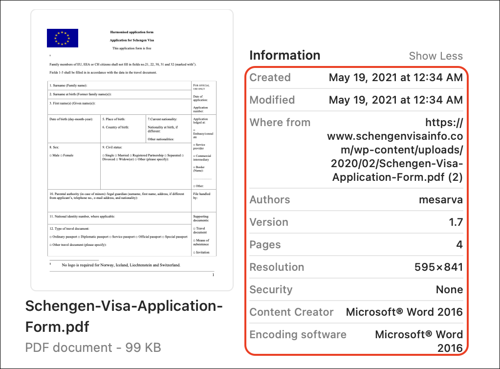As an overview, Metadata is a set of data that describes and gives information about a document/file. For example, a document can have important details embedded in it that describe the document itself such as its title and descriptive information, the author of the document, the time and date the file was created, or last modified, and so on. The screen below is a generic Visa Application document with its metadata highlighted to give an example of what metadata is.
