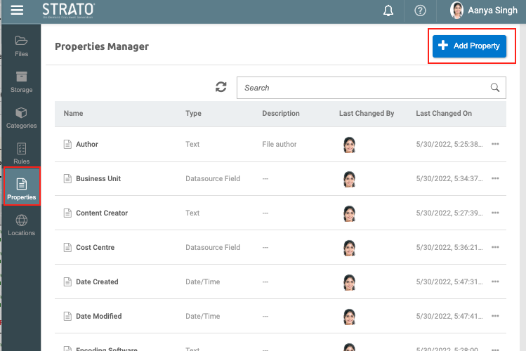 - Create properties to be used as metadata for documents/files in Strato Storage