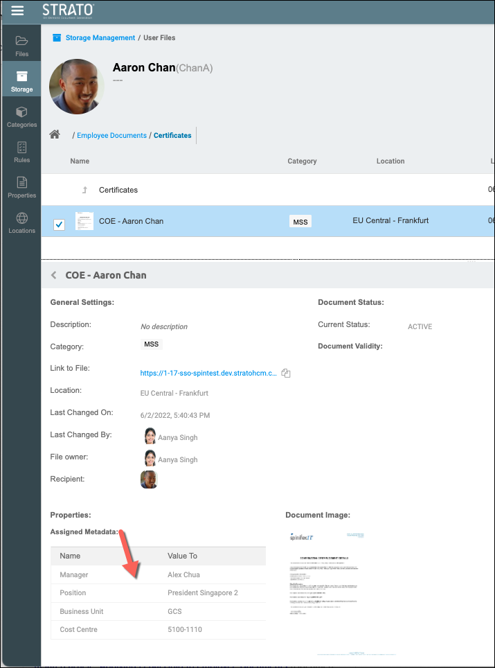In Strato's Storage Management solution, Properties can be assigned as Metadata to documents/files. The screen below shows an example of an uploaded document in Strato Storage for a specific employee (COE document for Aaron Chan in this example). With its general settings and all of its other details, is a specific section where the assigned properties or Metadata is displayed.