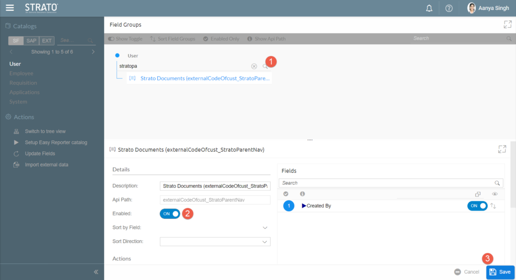 - Once the Update Fields job is finished, search for StratoParent and click the Enable toggle to ON to enable the Strato MDF. Click Save.