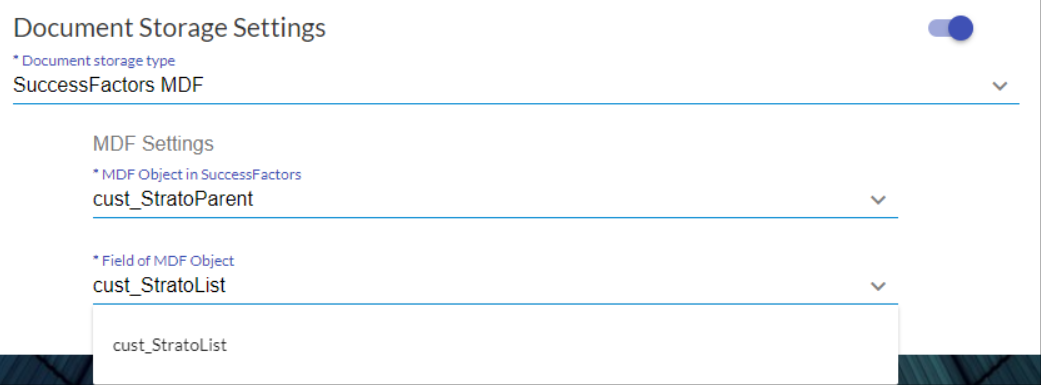 - After performing the fields update and enabling the MDF object, go to the Strato provisioning of your Strato instance. The MDF objects should be available in the dropdown under Document Storage Settings.