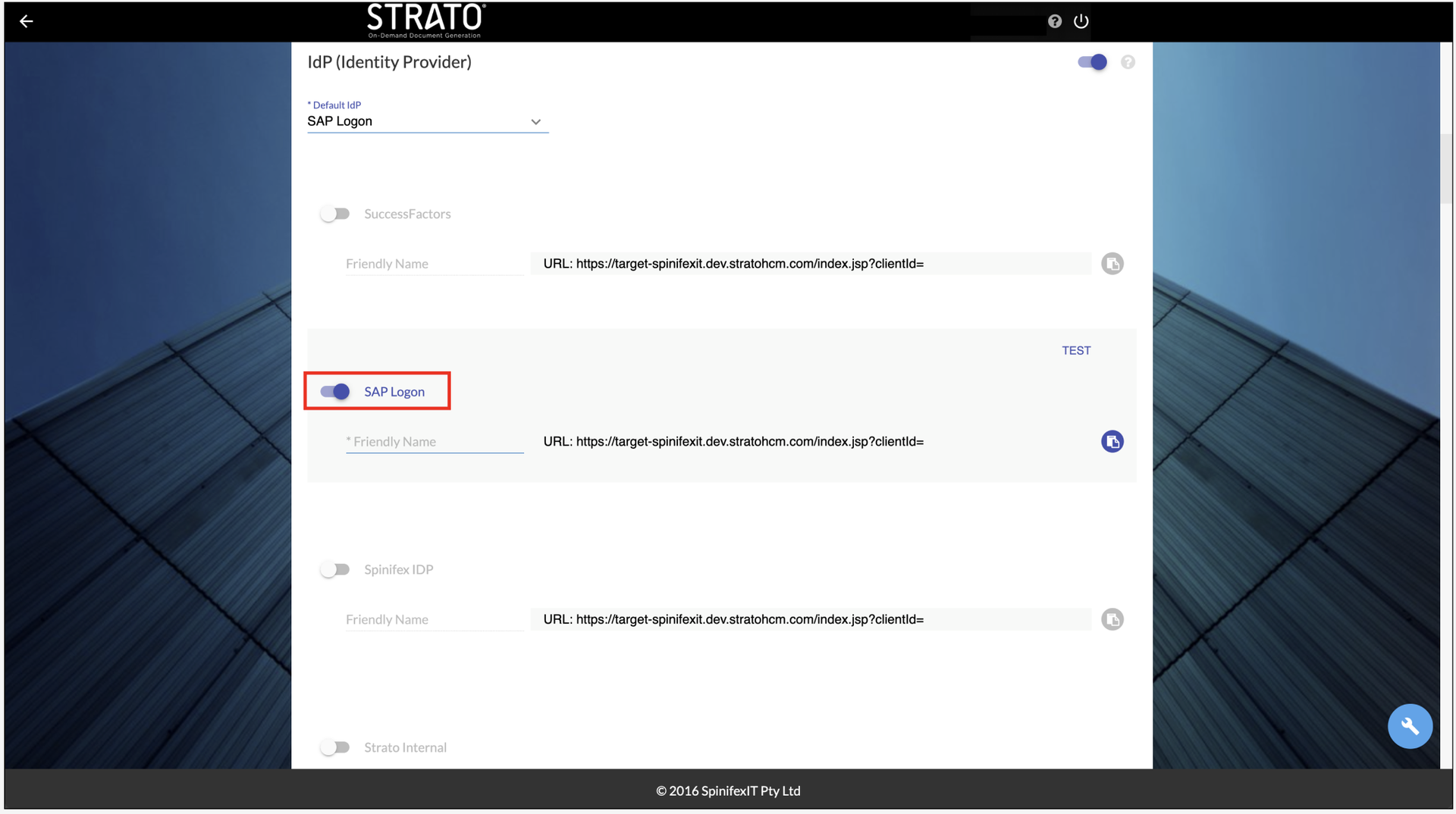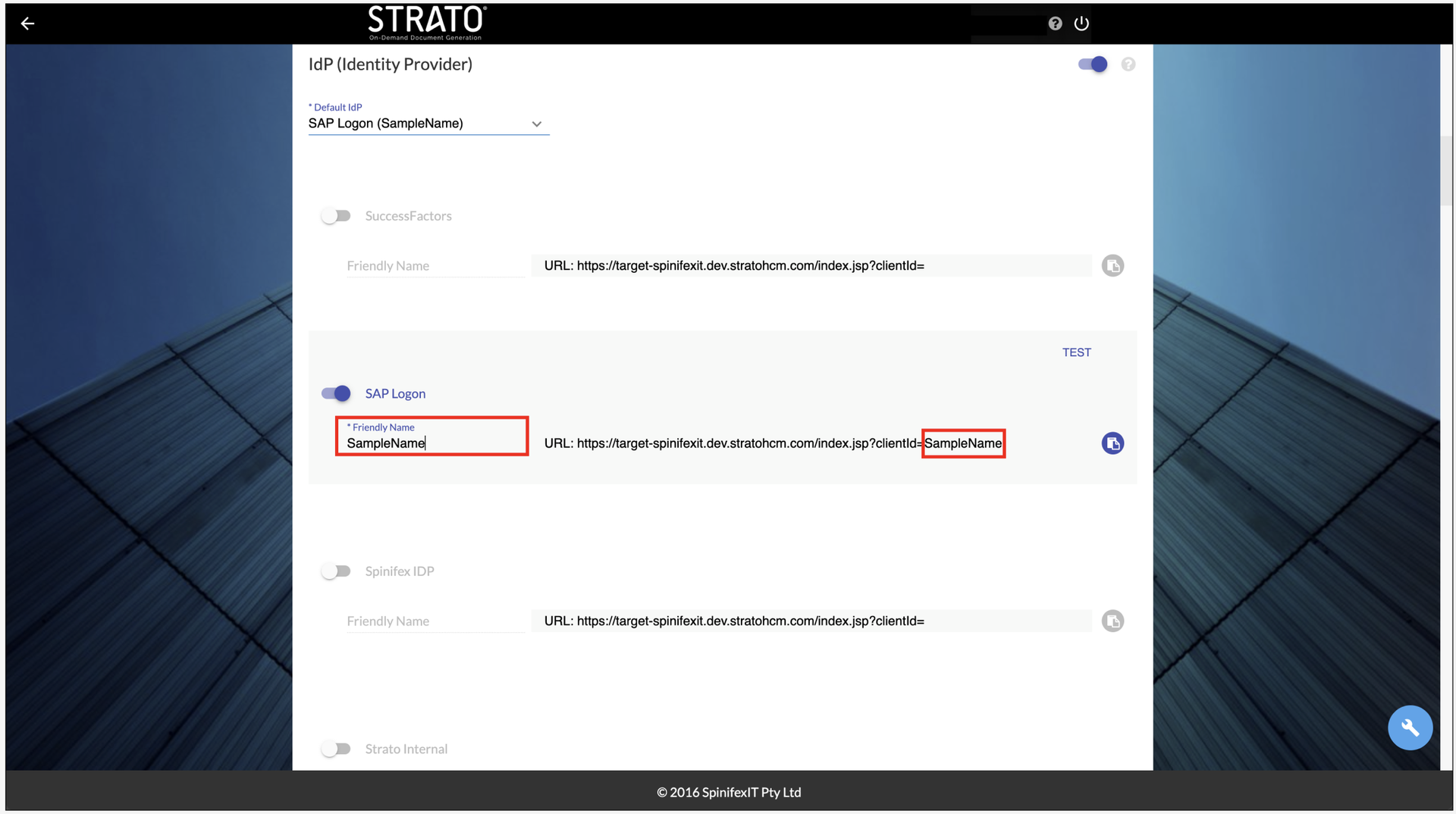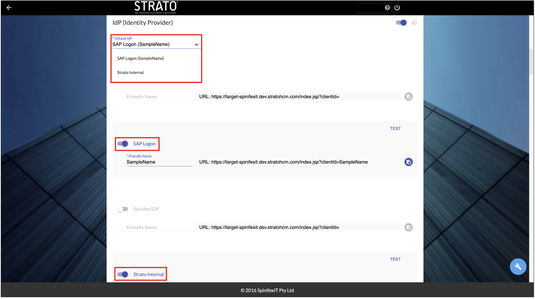 Notice that only SAP Logon and Strato Internal (StratoInternal) are displayed since these are the only two options toggled ON. When there is no IdP enabled, the Default IdP dropdown field will be disabled.