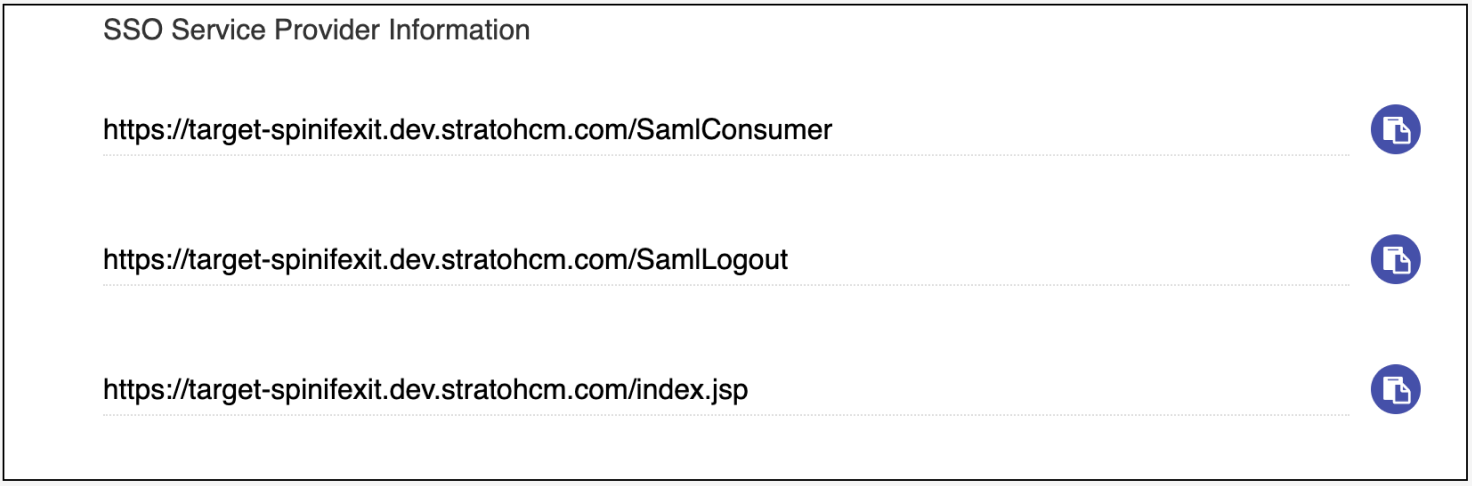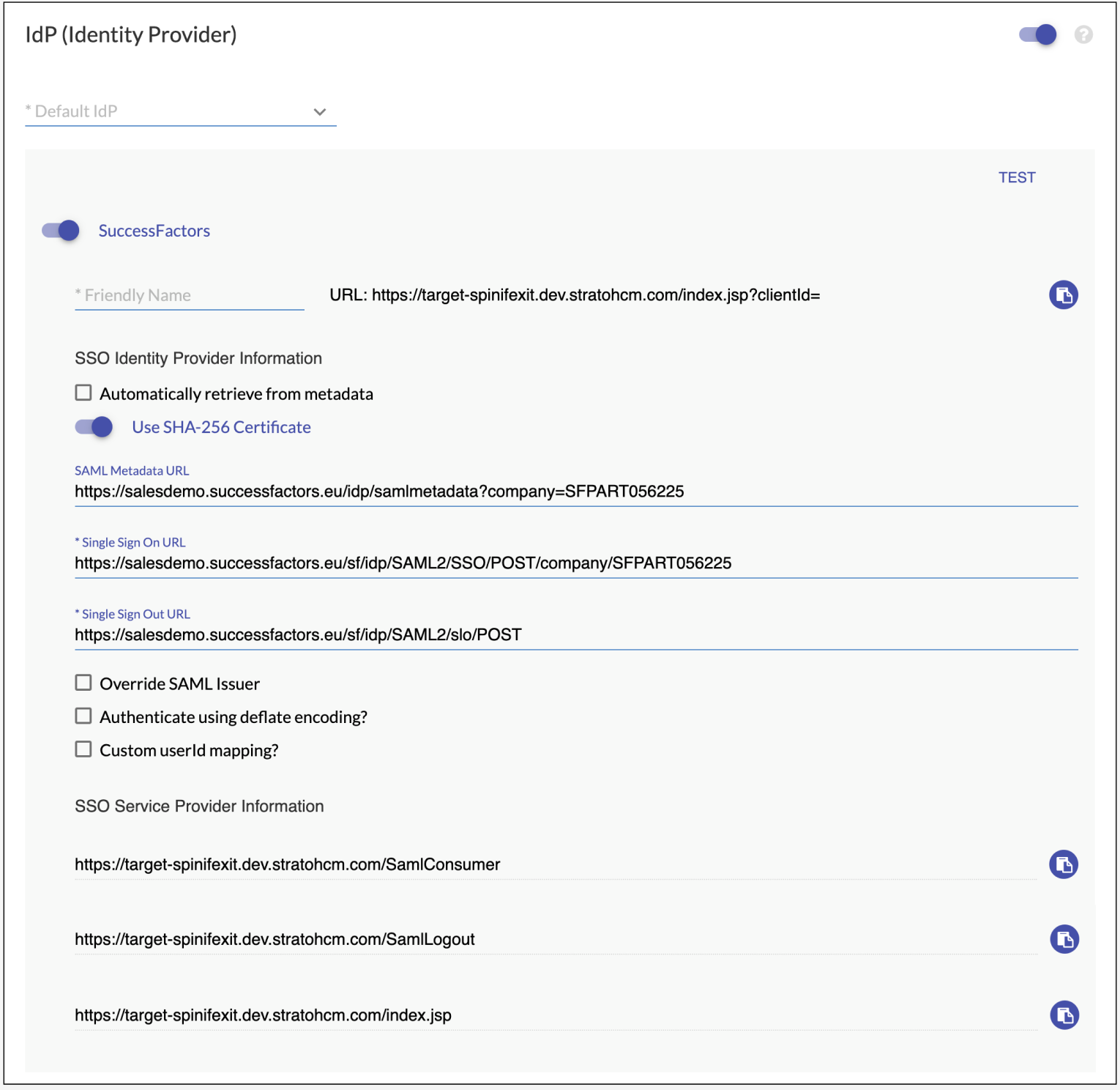 Strato leverages single sign-on capabilities of SAP SuccessFactors to create a fully integrated and secure user experience. When the SuccessFactors IdP is enabled, users must specify the SAP SuccessFactors' base URL and combine it with the other URL addresses as shown below.