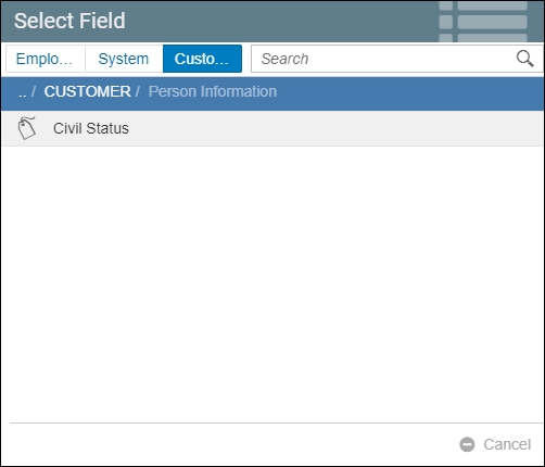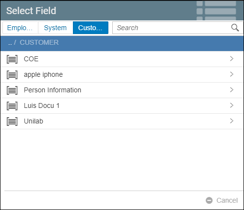 - It will ask you to select a field, go to the Customer tab and then select the field group you just created and then click a field.