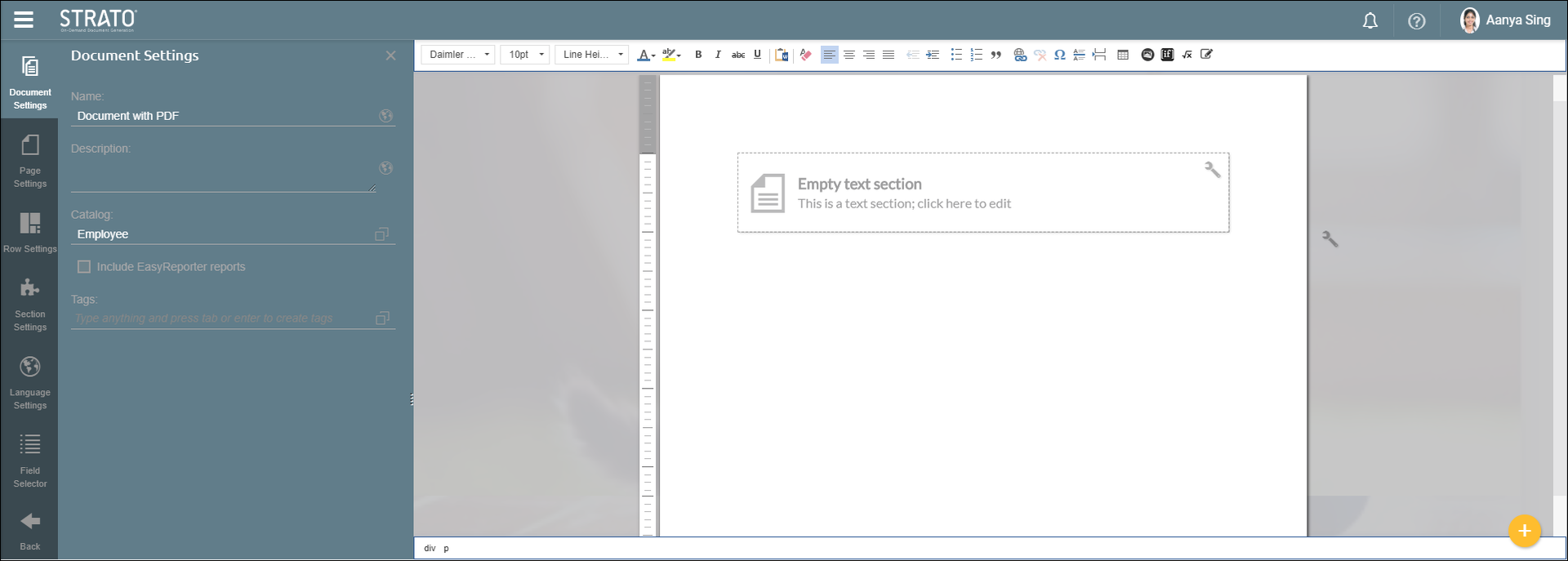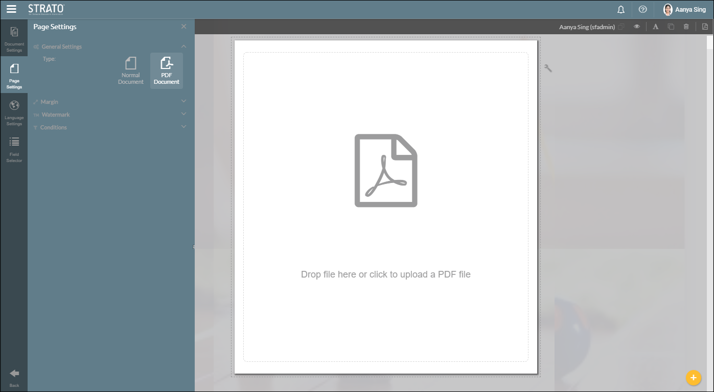 PDF files can be uploaded into Strato and used as document templates. Once uploaded, you can add fields and conditions to it. These PDF files can be saved and used like other normal documents.