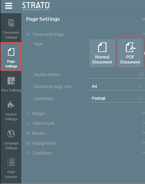- Click Page Settings. Under General Settings, click PDF Document as the Type.