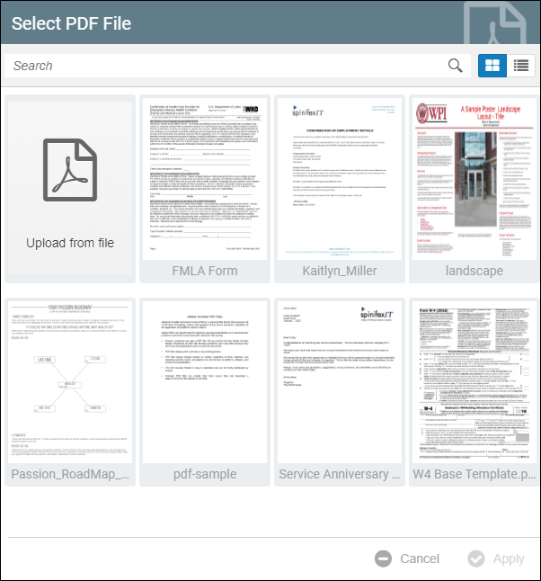 - Click the page to open the Select PDF File window. You can select from existing PDF files, or you can upload your own PDF file by clicking the Upload from file button. You can also upload a PDF file by dragging and dropping the file into the page.