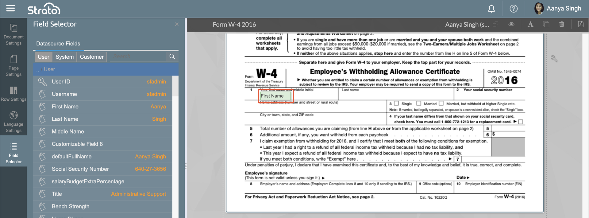The Replace PDF button allows you to re-upload a PDF document or select from pre-delivered ones. - Click the Field Selector tab to start inserting fields into your PDF file. To insert a field, drag a field and drop it into your PDF file.