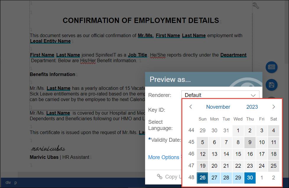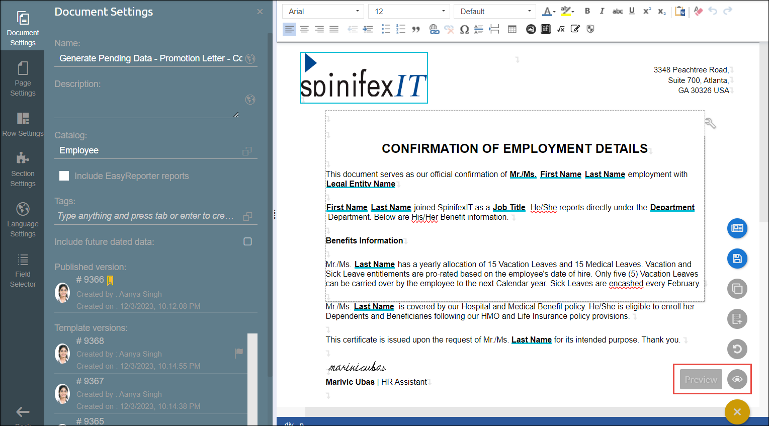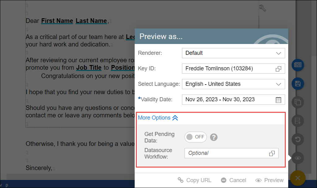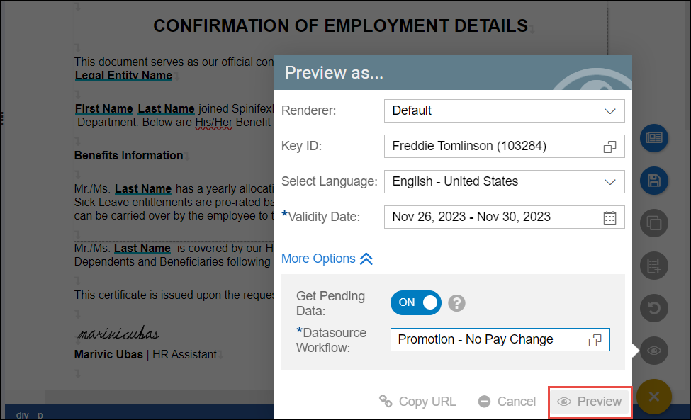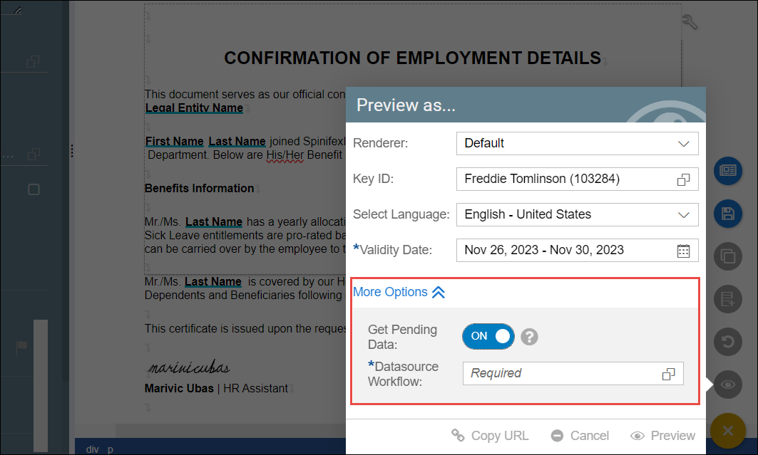 SuccessFactors pending data can be displayed and applied when creating or generating templates in Strato. Additionally, you can preview a document containing SuccessFactors pending data directly from your Strato Document Template Editor. This feature enables users to immediately view the generated output of documents with SuccessFactors pending data, eliminating the need to run it from the Dashboard - Generator Card.