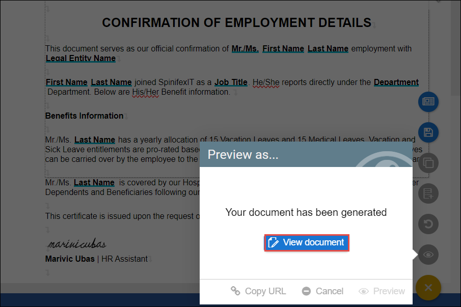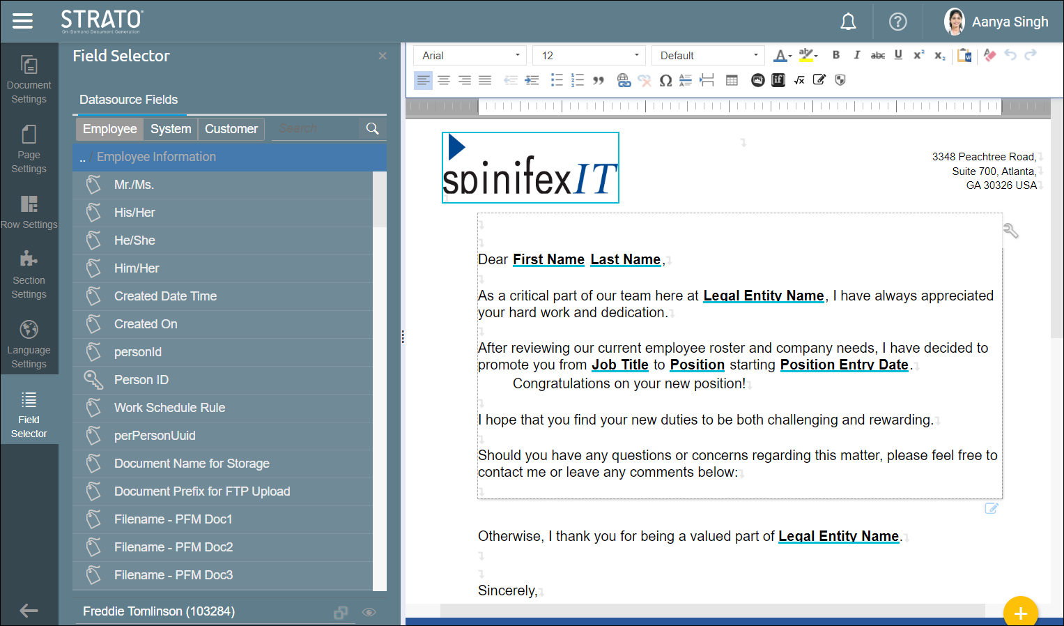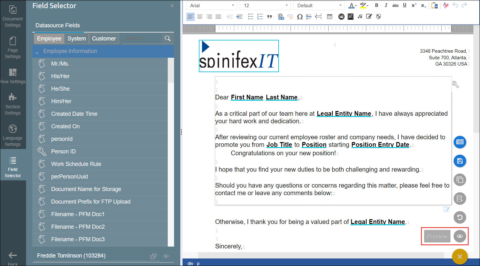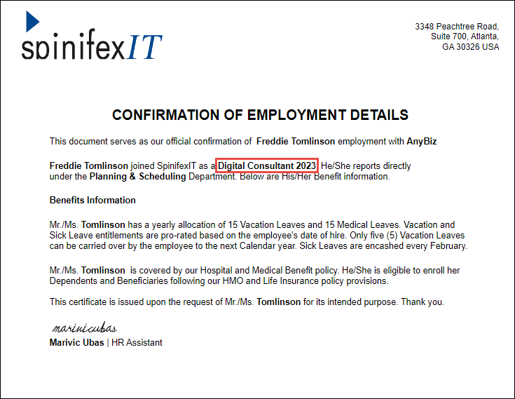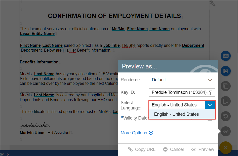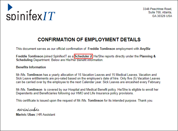 In this example, we are using a Confirmation of Employment Details template that contains active or current fields from SuccessFactors.