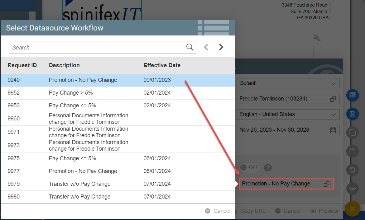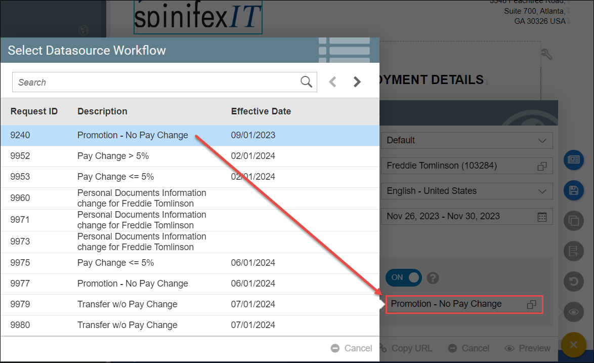 - Next, choose the relevant workflow from the Datasource Workflow field associated with the selected employee. In this example, we are selecting the Promotion - No Pay Change workflow.
