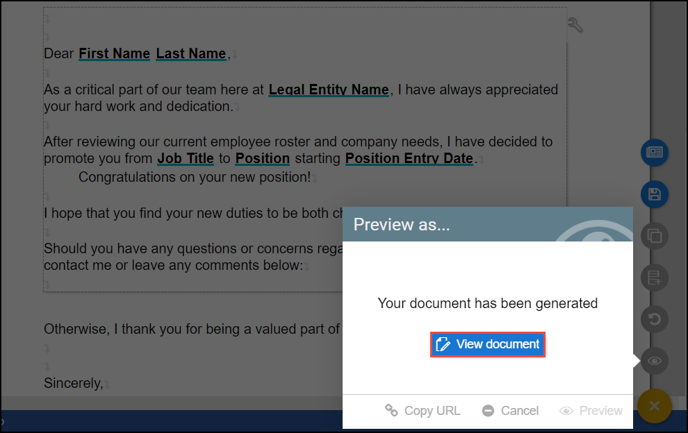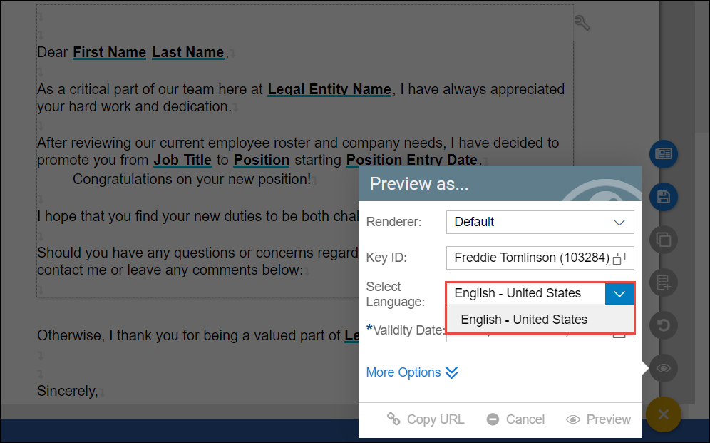 Users have the option to create documents that display both the current and pending information of the employee. To illustrate this, let's use a Promotion Letter as an example. For instructions on creating documents with both current and pending information, read: Creating Documents with Data from Pending SuccessFactors Workflow.