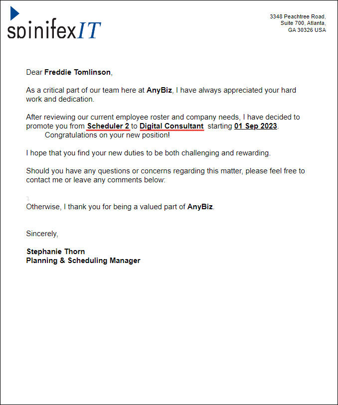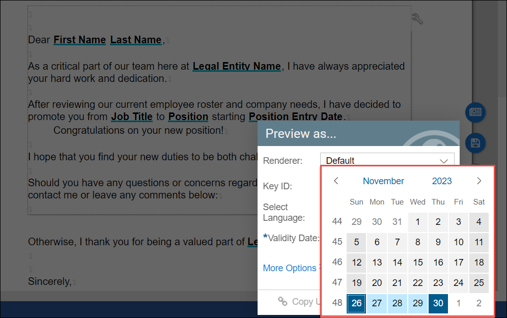 - Create or modify a document template that displays both current and upcoming changes for the employee. In this case, it's a Promotion Letter that contains both current and pending Job Positions.The pending Position field is sourced from the Datasource Workflow field group.