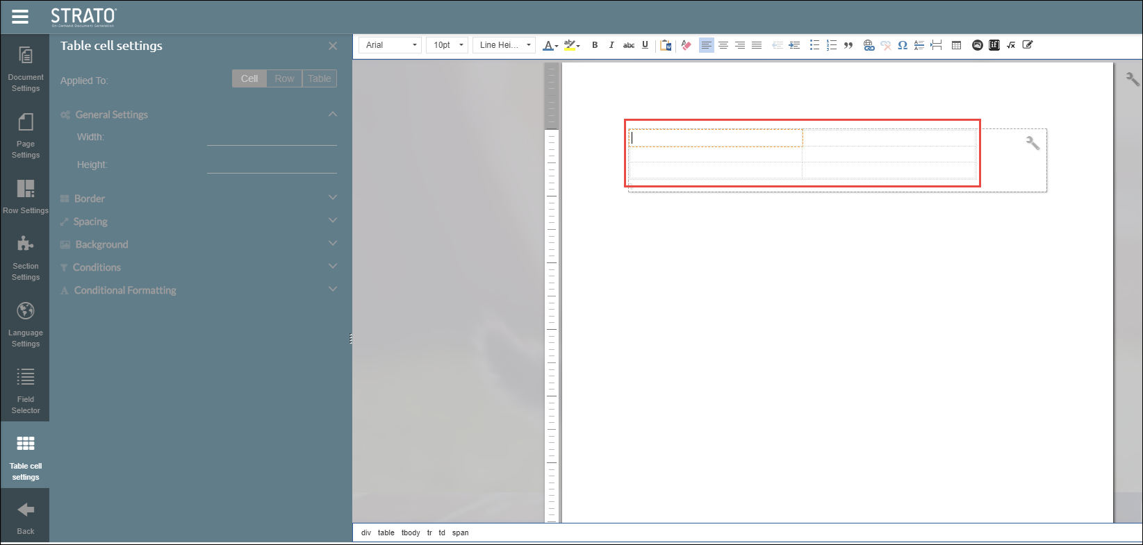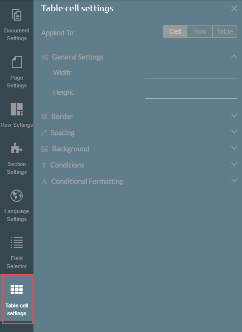 The Table Cell Settings tab will appear on the left side of the document template editor after you have inserted a table into your text section.