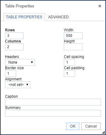 Set your Table Properties and then click OK.
