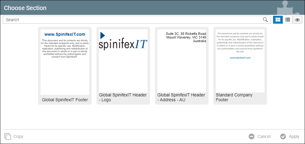 This displays the Section Library window where you can choose from the selection of pre-delivered, global, catalogue specific, or template specific sections, to load into the current text section you are working on in your document.