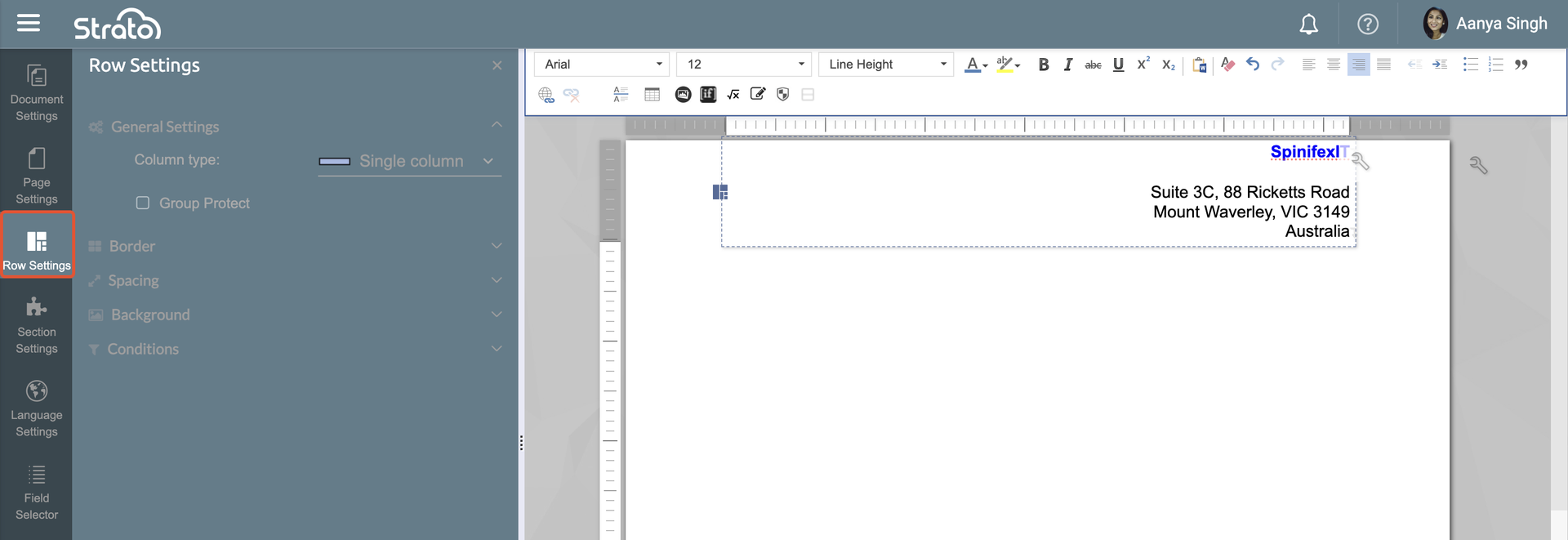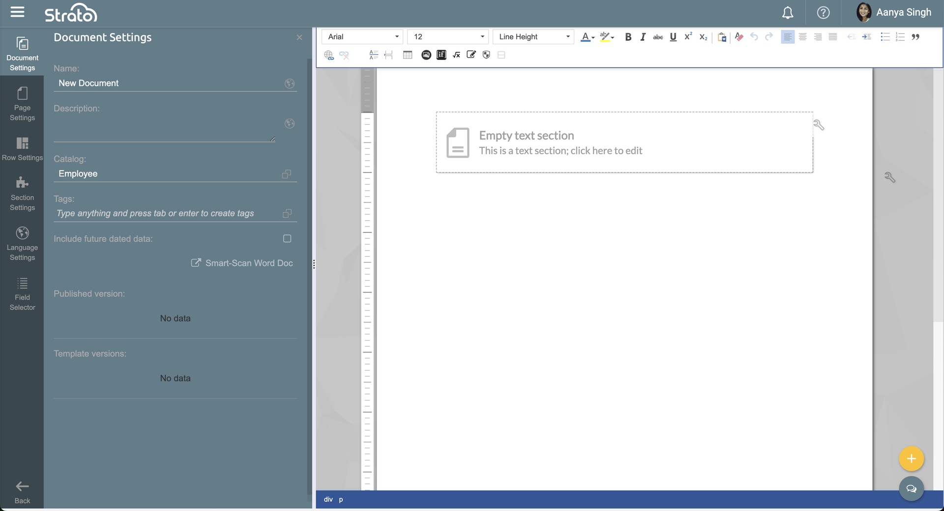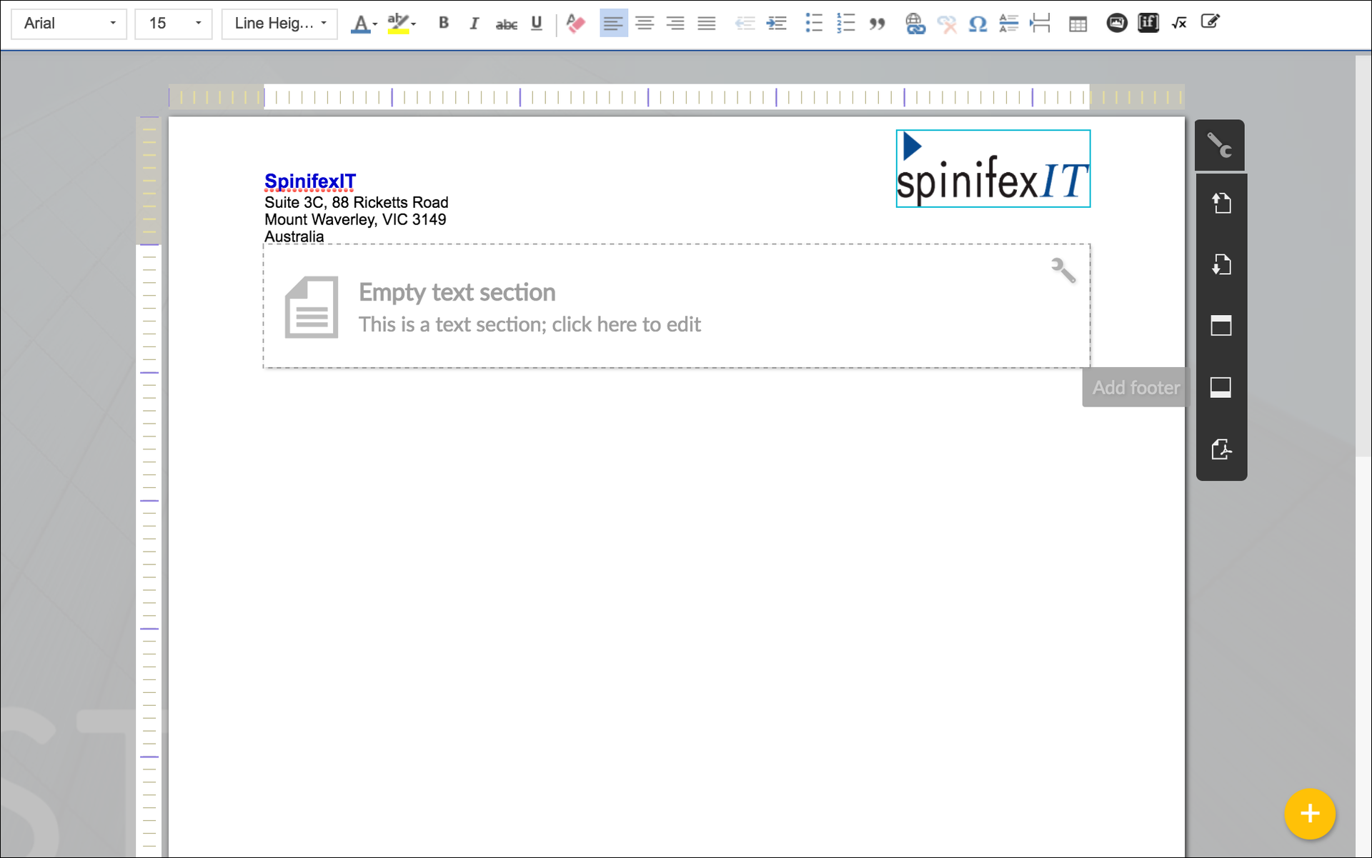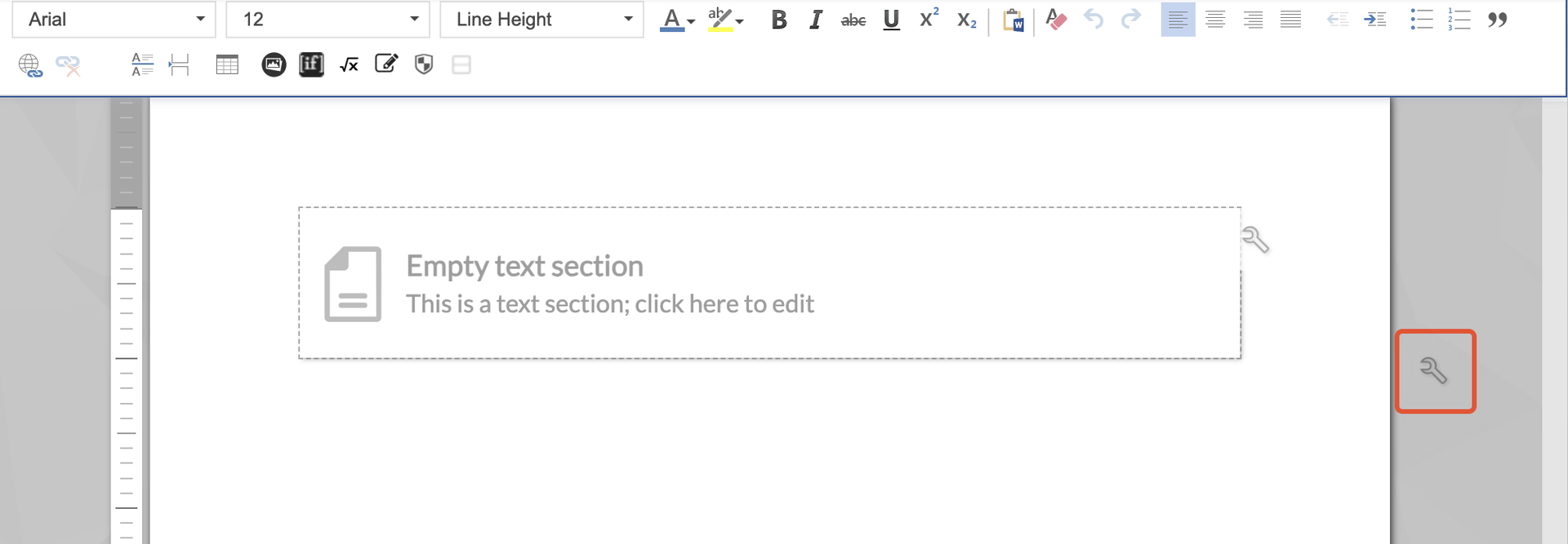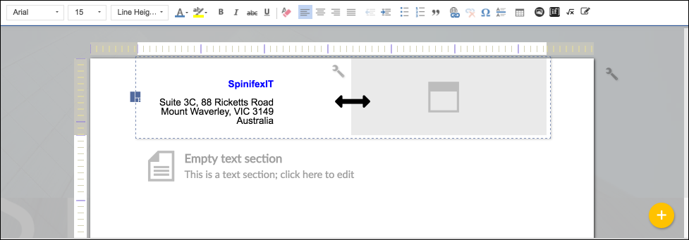 Text sections are available as soon as you create a new Document, Email, or Form Template. Text sections can host a combination of text and image elements, and can be used for creating the headers, footers, and body of your templates.