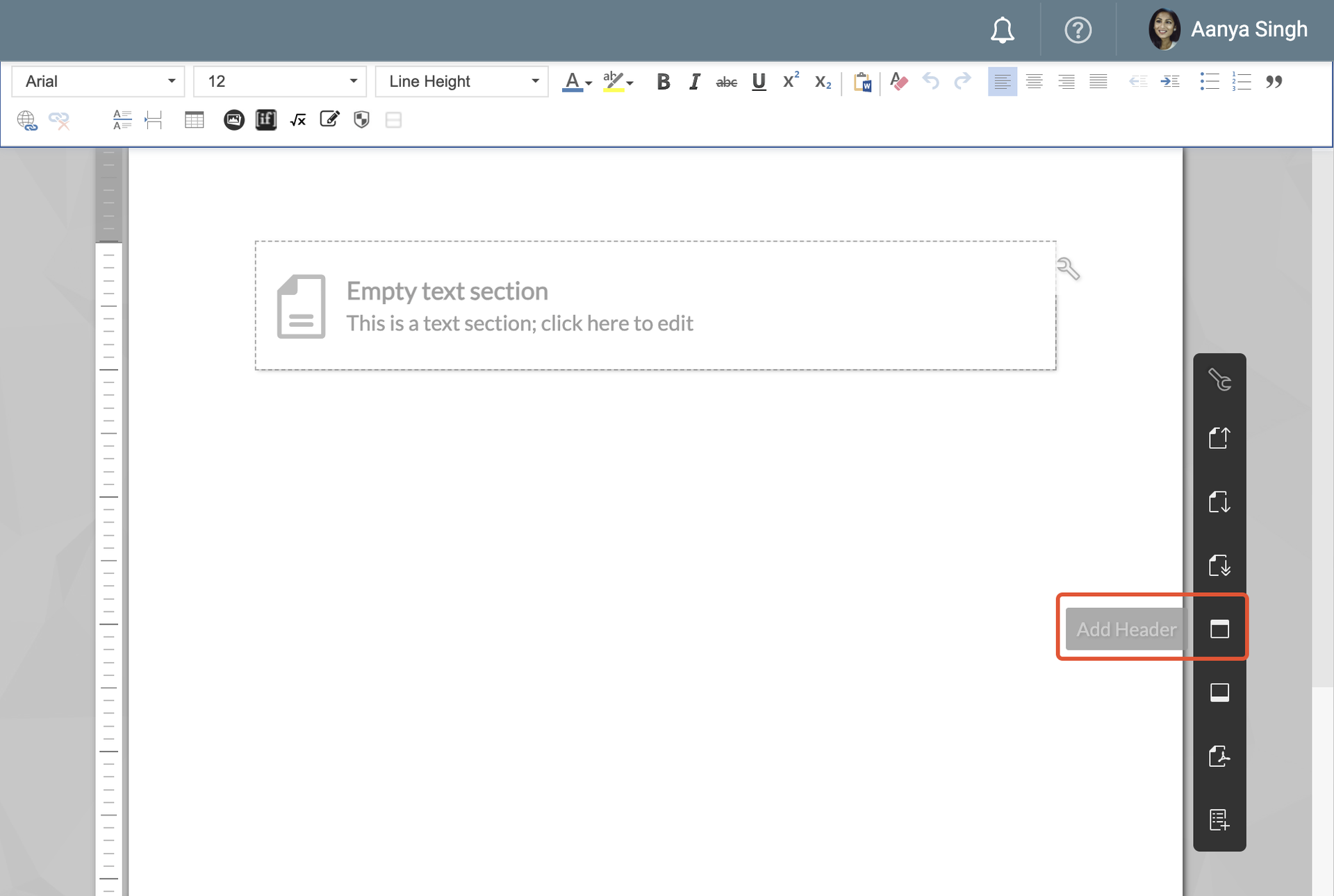A new box will appear on top of the existing text section in your document template. You can type and format your text into the header's box, and change the size and alignment of the header by adjusting the page's margins.