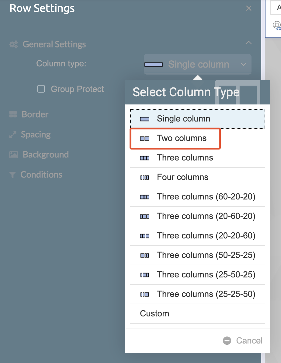 From the Column Type, select Two Columns. You can also choose the other column options for headers, content, or footers that require more than two columns.