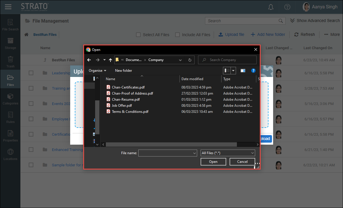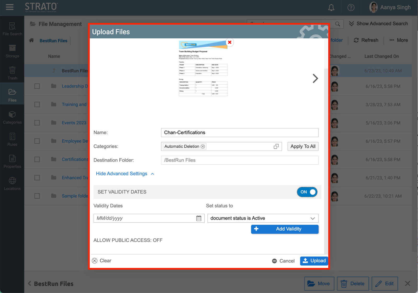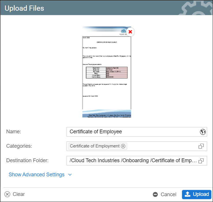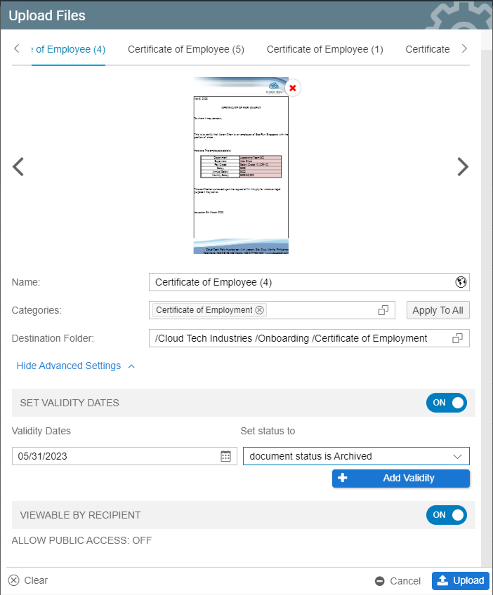 - The files will begin uploading shortly in the Upload Files pop-up screen, the user may modify the Name, Categories, and Validity Date through the Advanced Settings. Navigation of Upload Files pop-up screen is further discussed in Single File/s Upload for File Management and Storage Management and Multiple File/s Upload for File Management and Storage Management.
