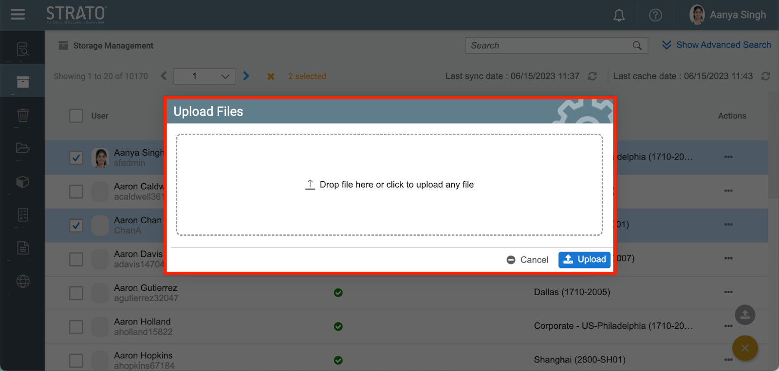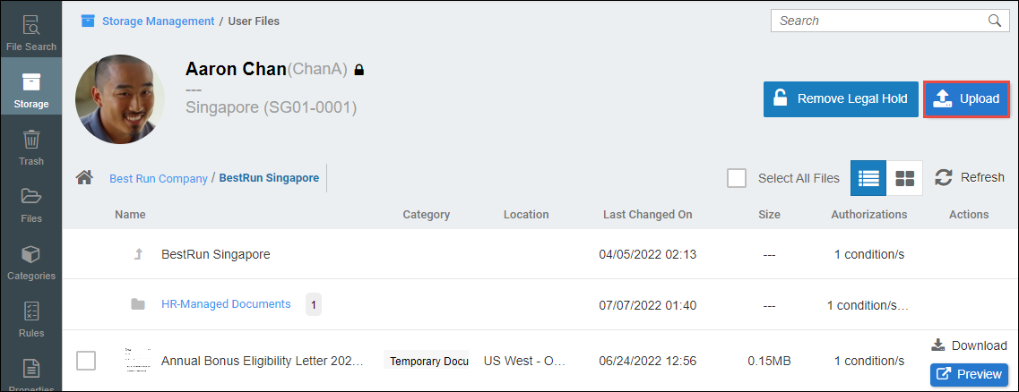 Within the storage management section, the user can utilize the upload button to add files to the storage.