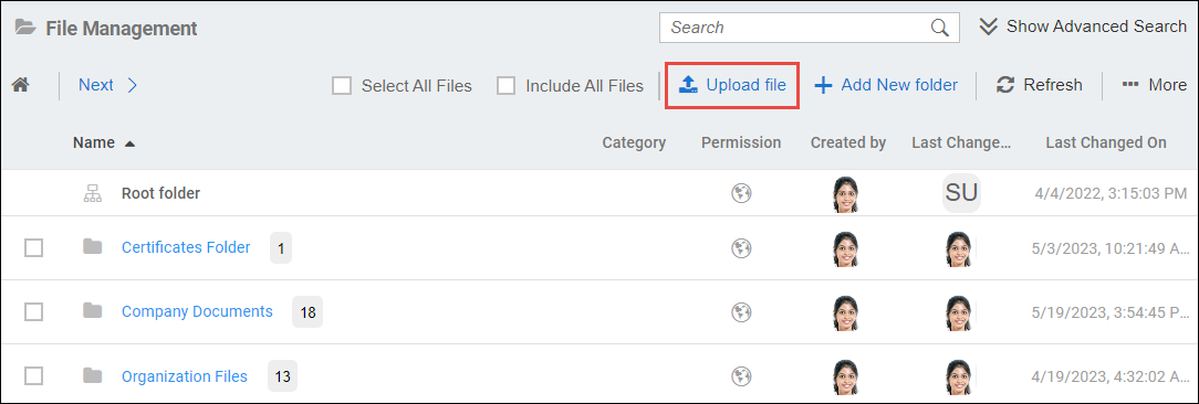 - To upload a file or multiple files in File Management, click on the Upload File button.