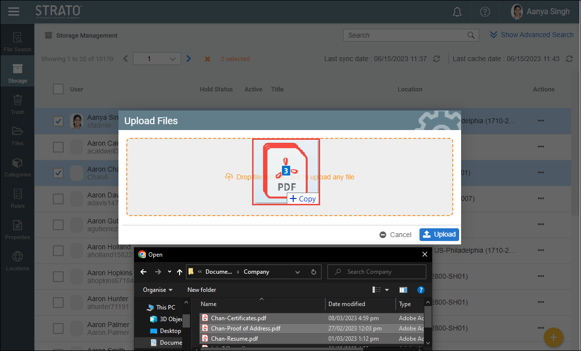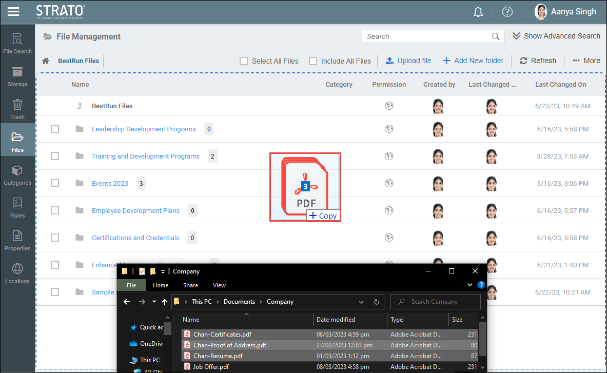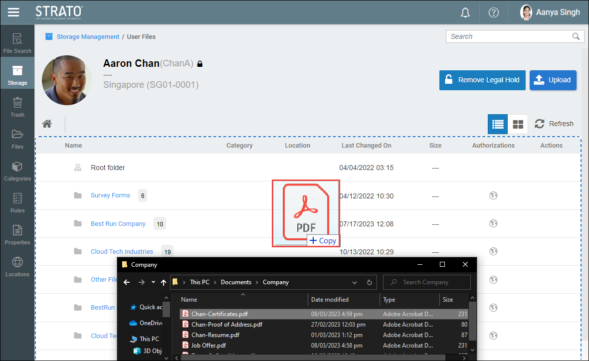 - To upload file/s using the Drag-and-Drop feature, navigate to the location of the file needed to be uploaded from the computer. Select and hold the file to upload to Strato Storage. A blue dotted line will appear around the designated drop area, indicating where the user can release the file/s.