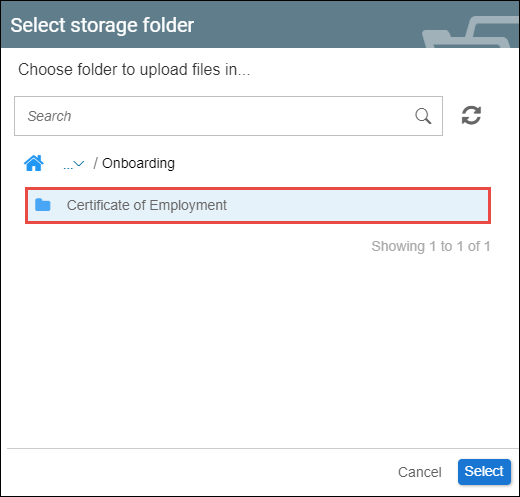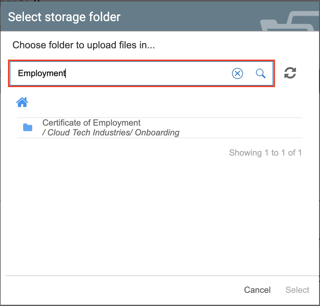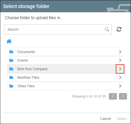 - To upload files into a subfolder, click on the arrow icon located at the rightmost side of the respective folder, This will lead to a list of subfolders. From the list, click the desired folder and click the 'Select' button.
