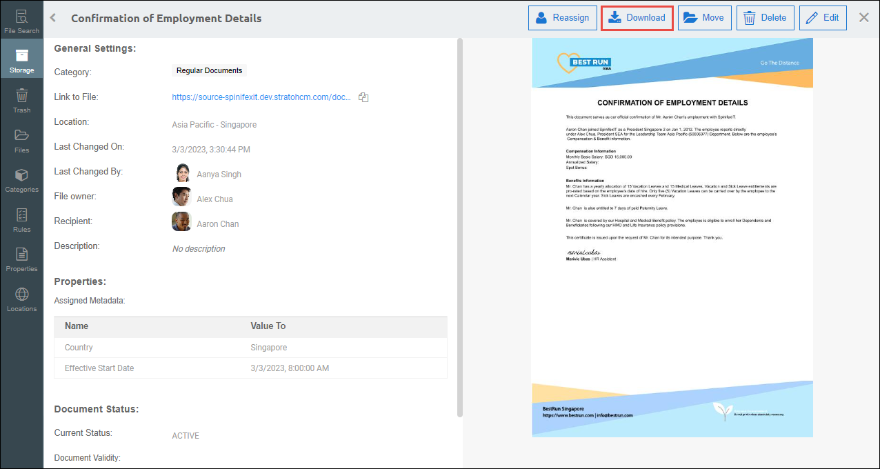 - A Download button is also available on the File Information page when the user views a specific file. This button is located at the top part of the preview pane.