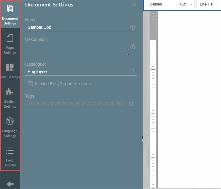 Within the template editor, there are multiple tabs on the left side of the screen for setting up your document, which are as follows: (click links below to know the actions and functions available for each setting)