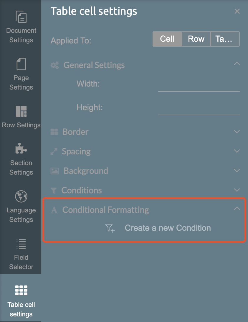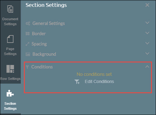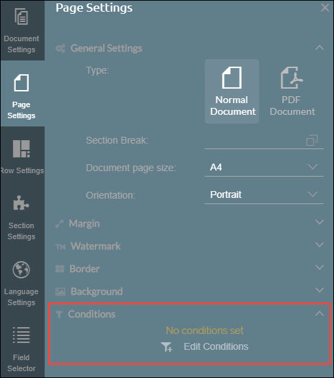 Conditions can be applied to text, pages, rows, or sections by selecting the appropriate object in the document template, then navigating to the appropriate settings.