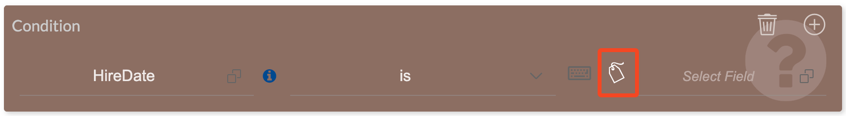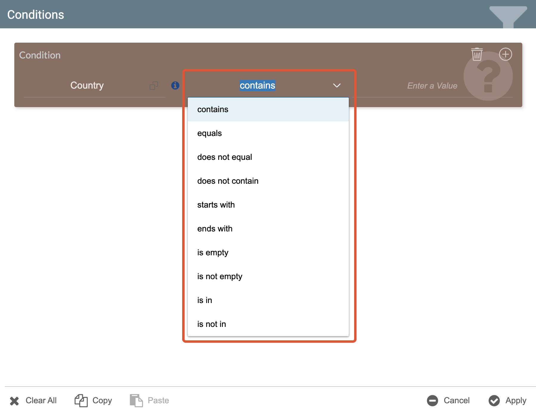 - Select the operator to be used in the comparison. The options will vary based on the type of field selected.