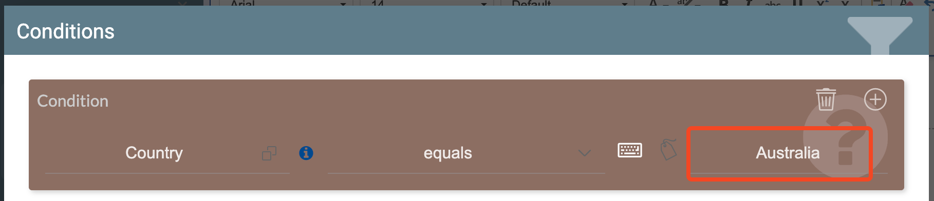 - Repeat steps 2-4 for each condition you will apply. You can add more conditions by using the + button in the upper-right corner of an existing condition, which will add the condition in the same group, or you can create a new condition group by clicking Add OR Condition or Add AND Condition.