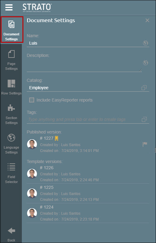 Document Settings allows document editors to rename their Document Template, add its description, and see versioning details. More details about this screen are in the table below.