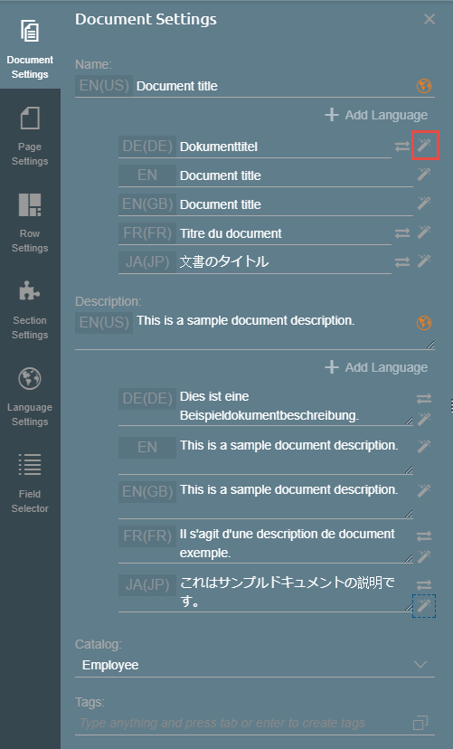 You can translate the Document Name and Document Description using the Add Language function, and clicking the Wand icon on the right side to automatically translate the texts. This setting functions as Google Translate.