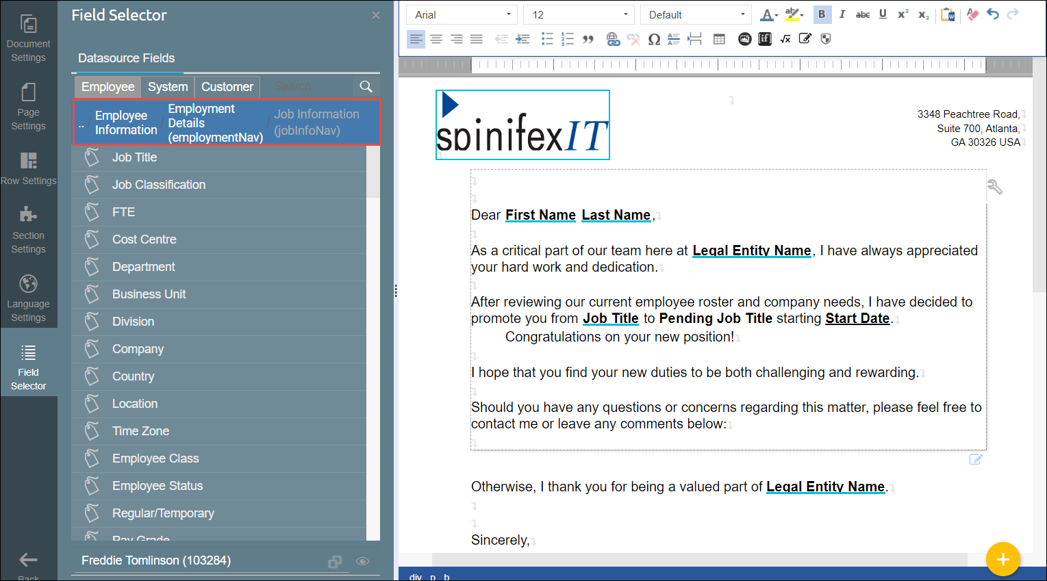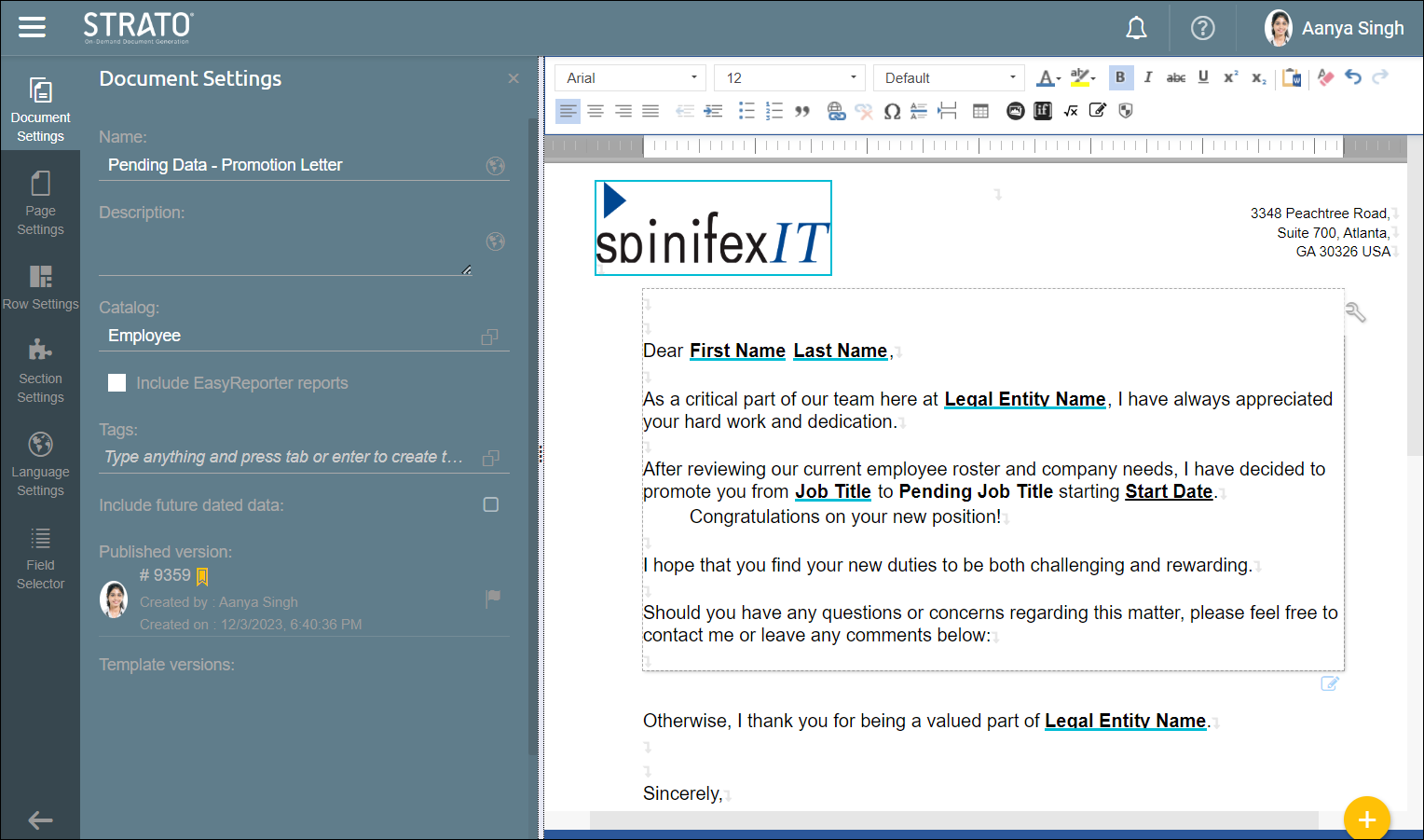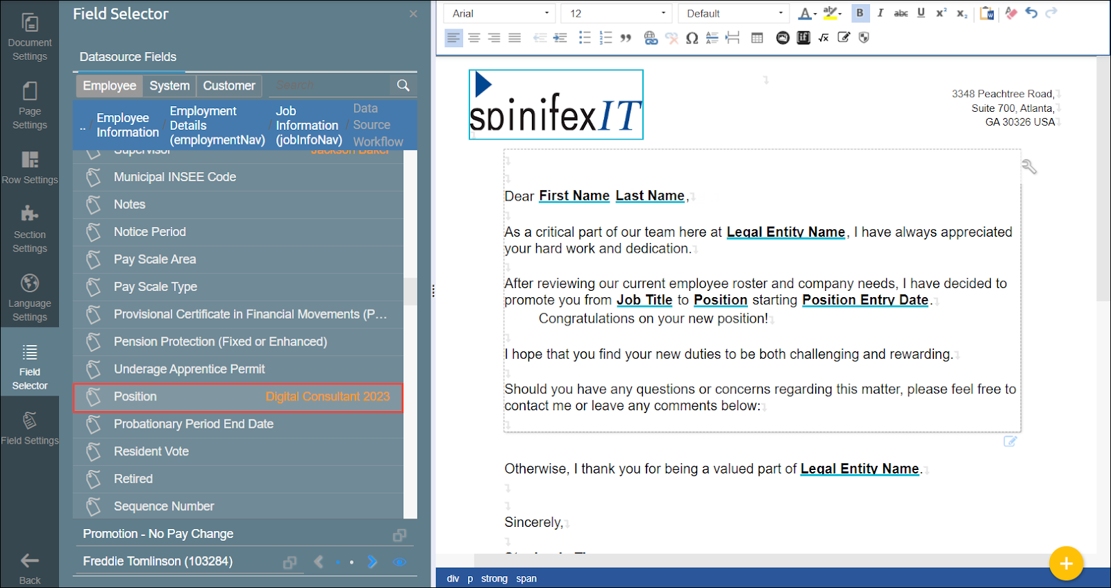 - Open or create a document in your Strato Document Editor that should include pending information for the employee. In this case, we will create a Promotion Letter displaying the current and pending Job Title, along with the Position Entry Date.