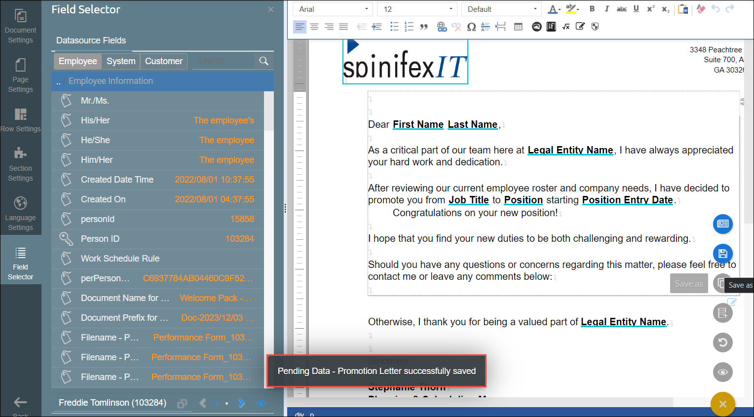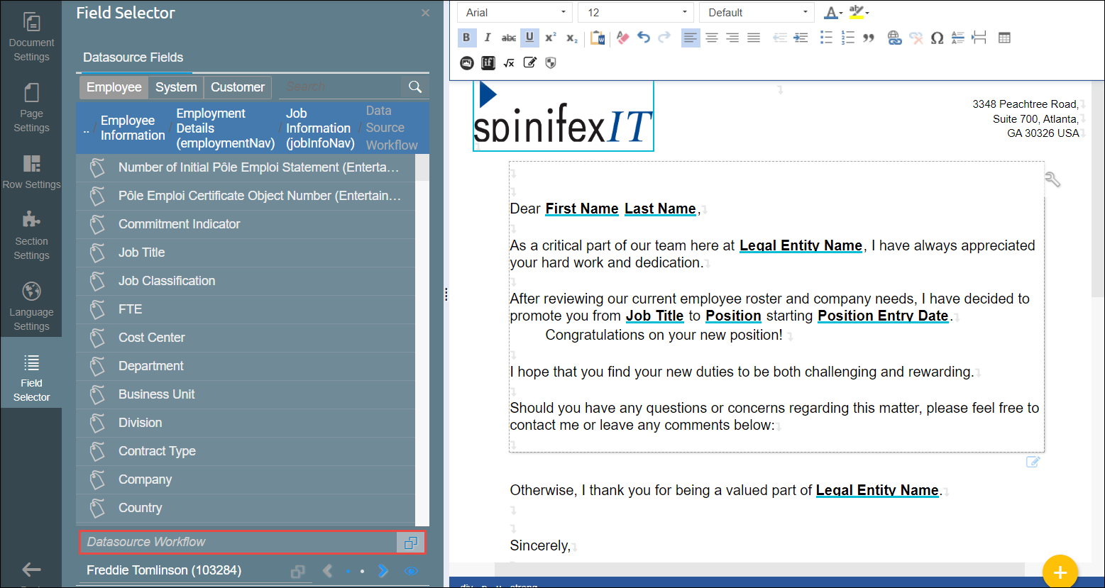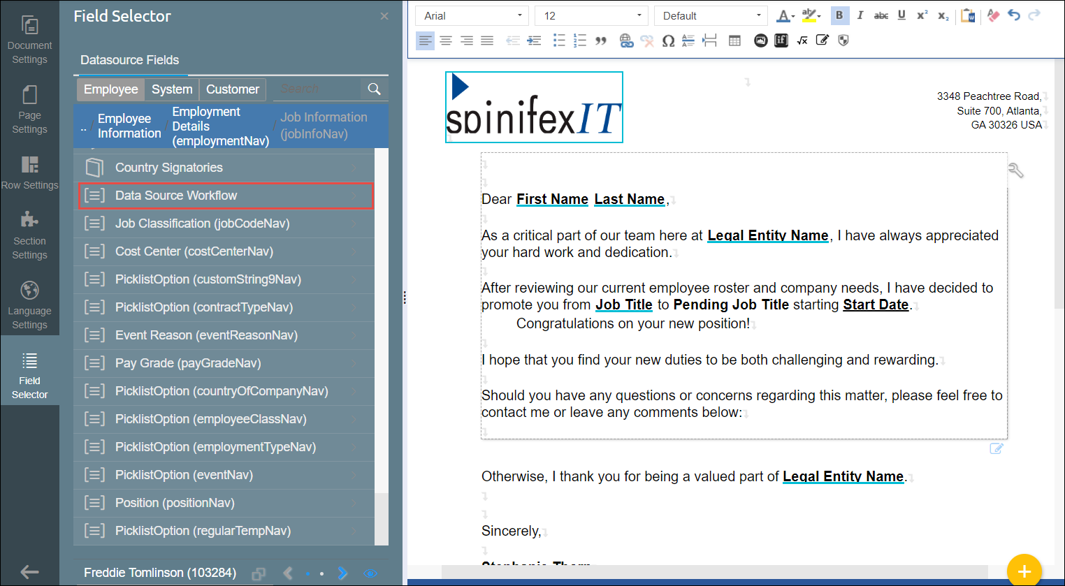 - Open or create a document in your Strato Document Editor that should include pending information for the employee. In this case, we will create a Promotion Letter displaying the current and pending Job Title, along with the Position Entry Date.