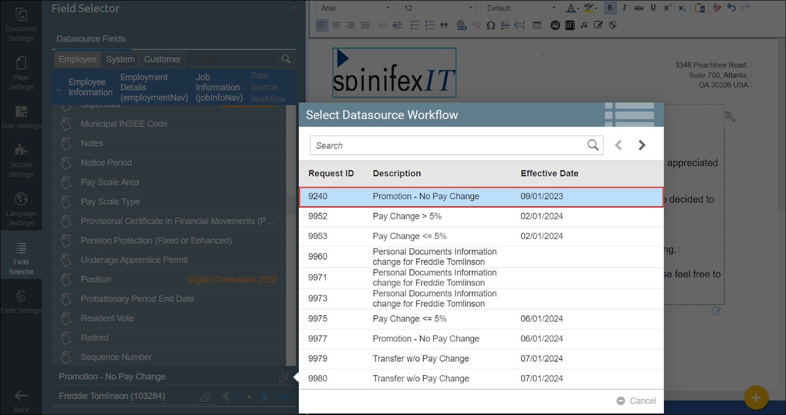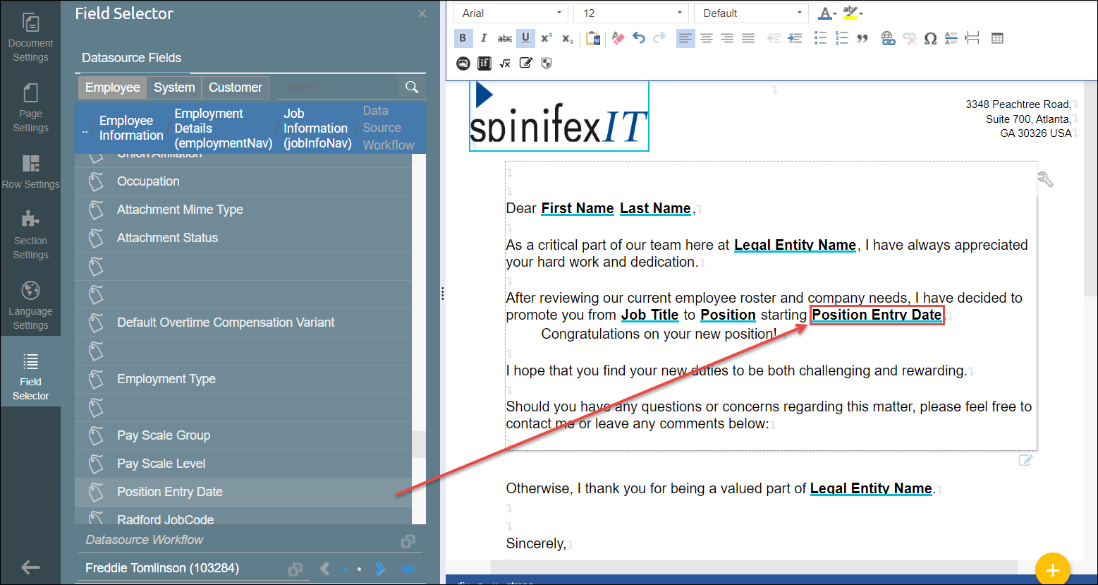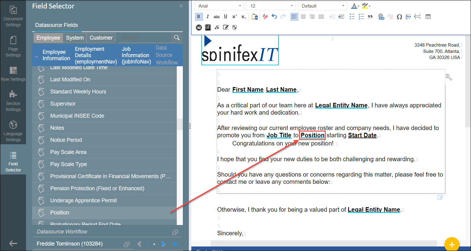 - Afterward, choose the relevant fields containing pending data to insert into your document template. In this case, the selected fields include Position and Position Entry Date.