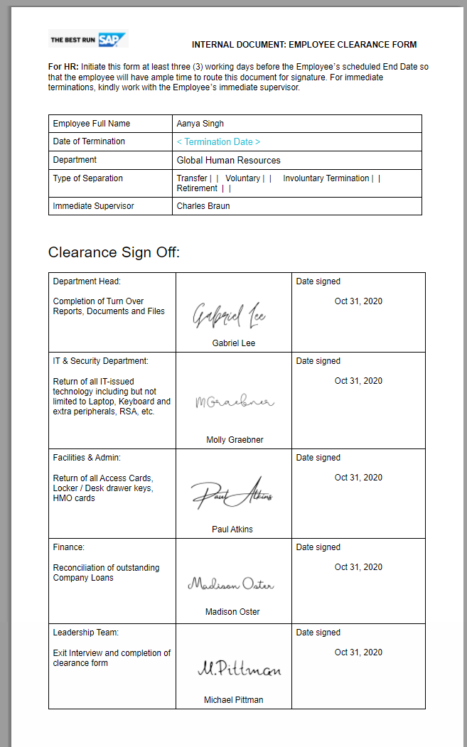 Another example, as shown below is a sample template for an Employee Clearance Form. This form is sent to signatories from different departments for an employee who is undergoing the Exit/Clearance Process to ensure that the employee has no outstanding liabilities before the exit. As you can see in this sample template, there are sections for different department heads where they can affix their signatures.