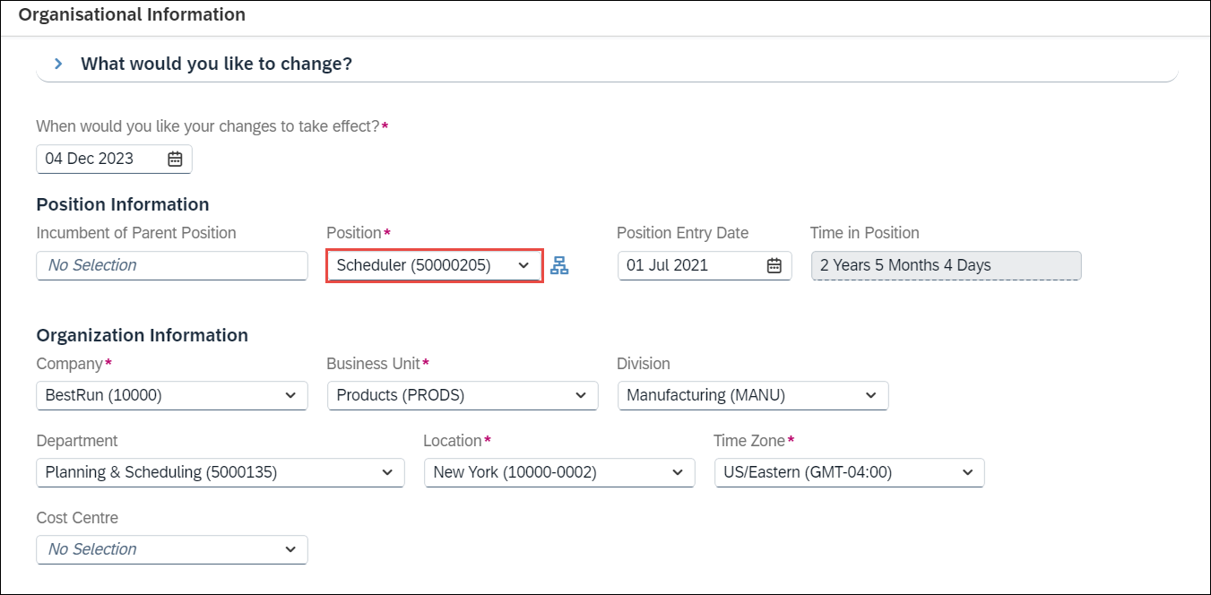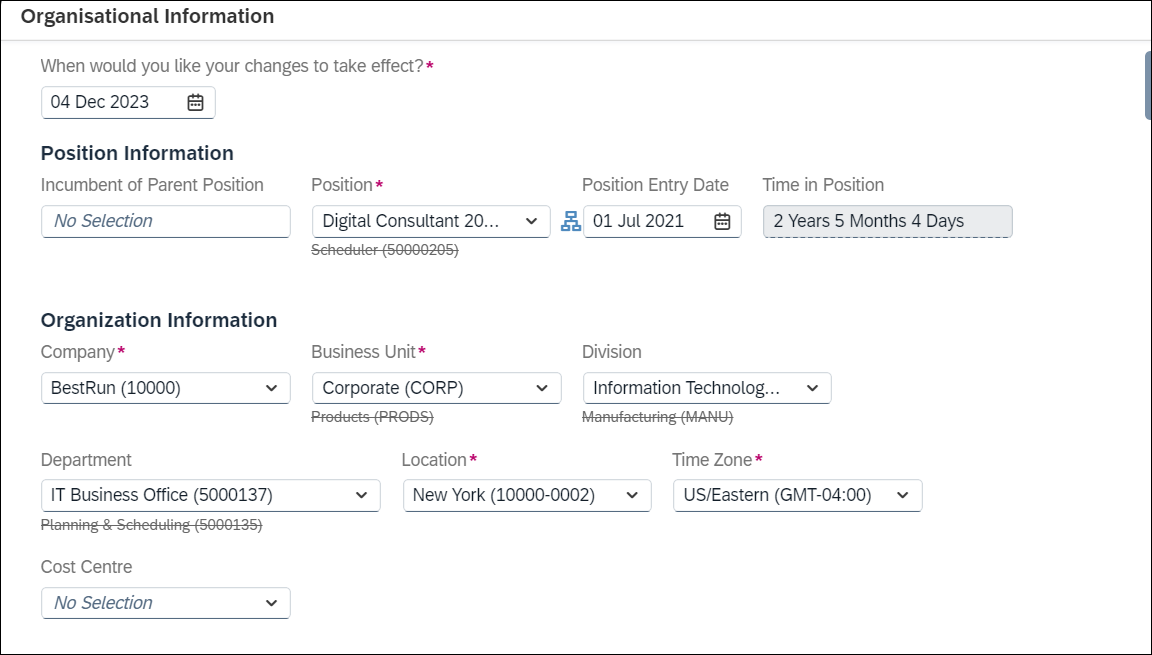 In this sample use case, an employee will have a Position Change from Scheduler (current position) to Digital Consultant (new position). This will be applied within the employee's Job Information in SuccessFactors, as shown in the screens below.