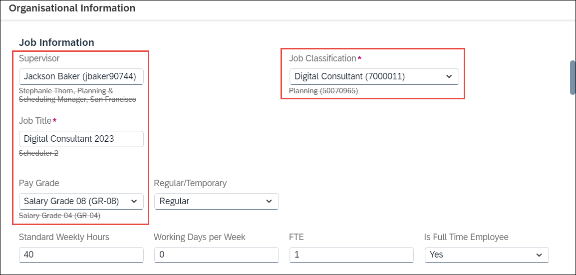 Together with the Position Change for approval, other Job and Compensation information will change as well such as the new Supervisor's name, Job Classification, Job Title, and Pay Grade information: