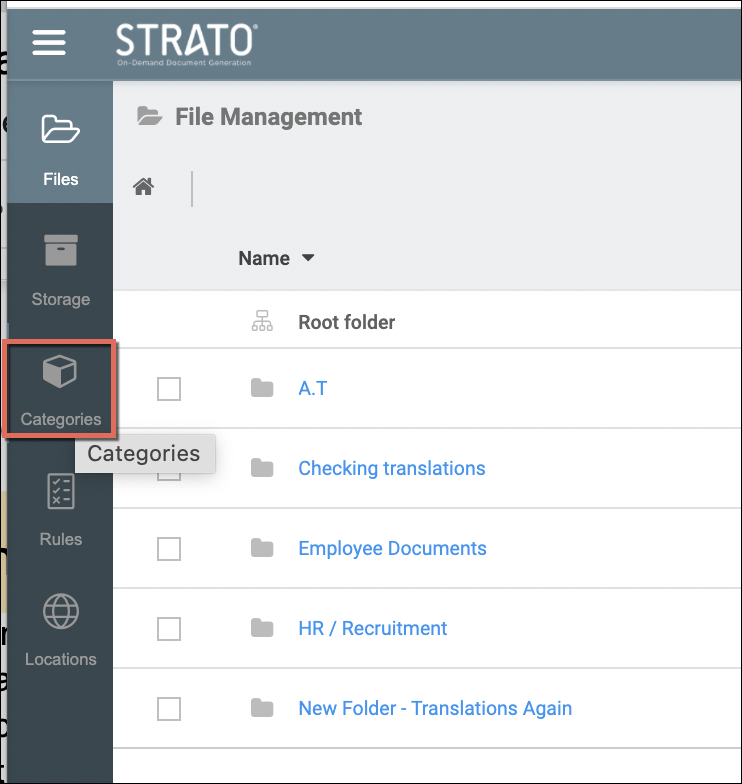 To access the Category Management module in Strato, access the Storage Settings either from the left menu panel or from the tools widget from the main screen/dashboard of Strato, as shown in the screen below. Then click on the Categories menu. (Access here will depend on the organization's Category Management users' authorization settings.)
