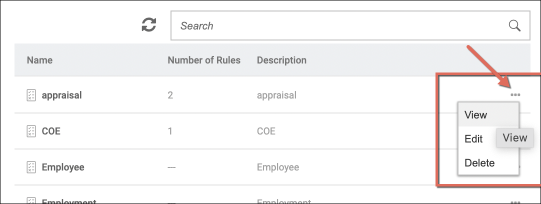 - Action button per category with options to: View, Edit and Delete