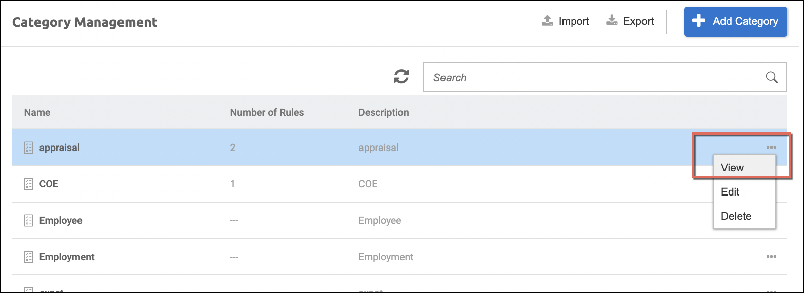 - Option to Enable, Disable, and Delete a rule(s) assigned to the category.