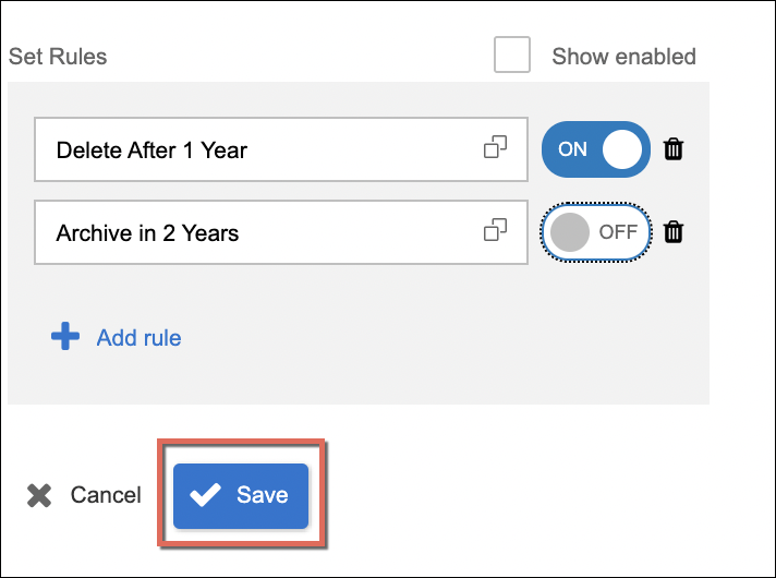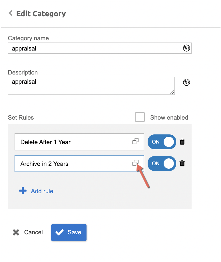 - Add Rules - to add and assign validity rules to the category. It can be one or more rules and the selection of rules is set and configured from the Rule Definition module of the File and Storage Management.