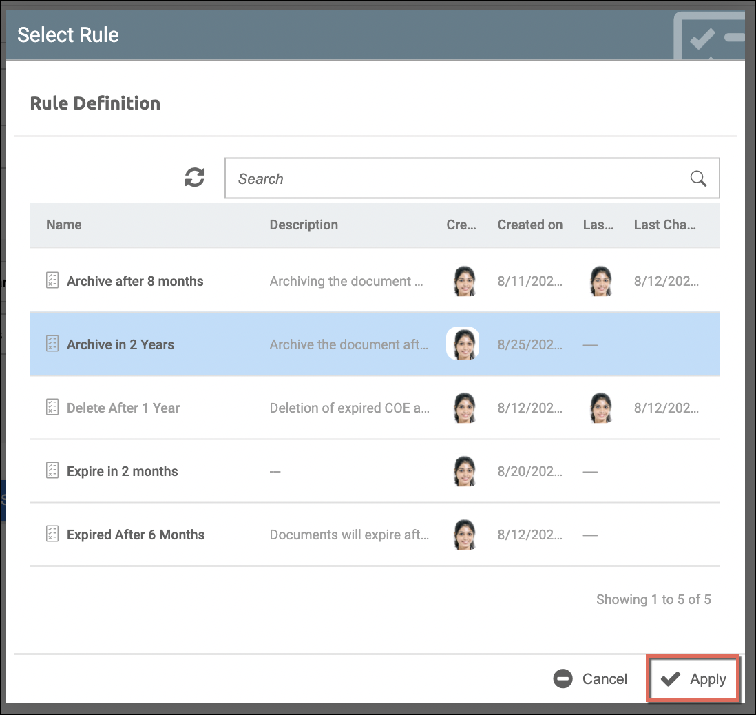 - Set/Change Rules - the already assigned rules can be changed just by clicking the selection icon. This pops up the list of rules defined (from Rule Definition). Clicking Apply will adapt the selection/change: