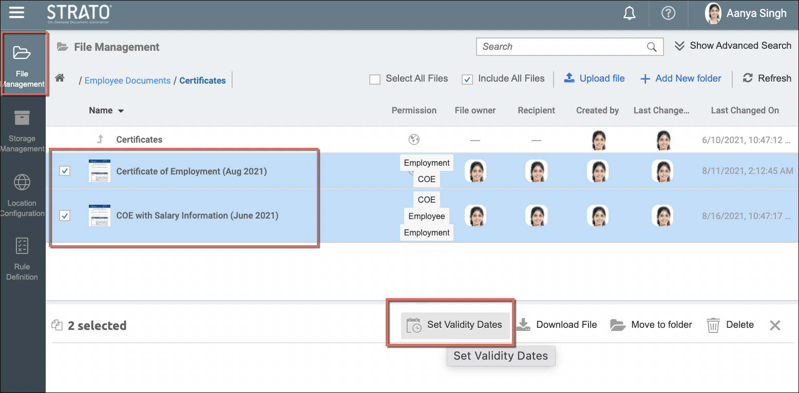 In File Management or Storage Management, there is a feature to apply validity rules (or validity dates) to multiple documents. This is simply done by clicking the Set Validity Dates button after selecting the multiple files that need validity dates to be set.